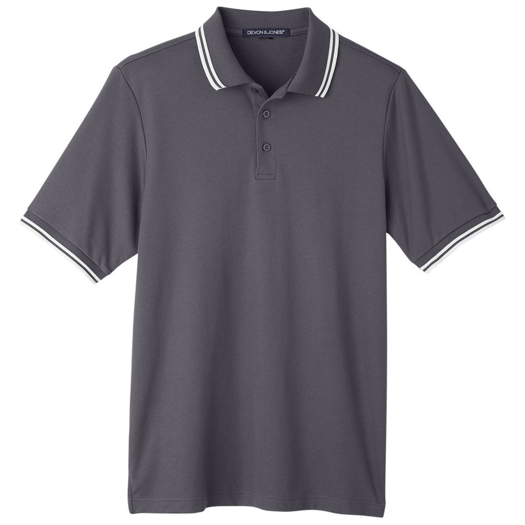 Add embroidery to the Devon & Jones Men's Graphite/White CrownLux Performance Plaited Tipped Polo to create a look that looks just as great on the putting greens as in the office. Made of 100% polyester face plaited to a polyester cotton blend this moisture wicking shirt offers UV protection in an active fit. The dual color with solid base and stripes on the collar and sleeves will showcase your custom logo as part of a uniform or employee apparel that workers will want to wear. Add your design to create a custom gift that will fit into most wardrobes.Corresponding Women's Style: Devon & Jones Women's Graphite/White CrownLux Performance Plaited Tipped V-Neck Polo