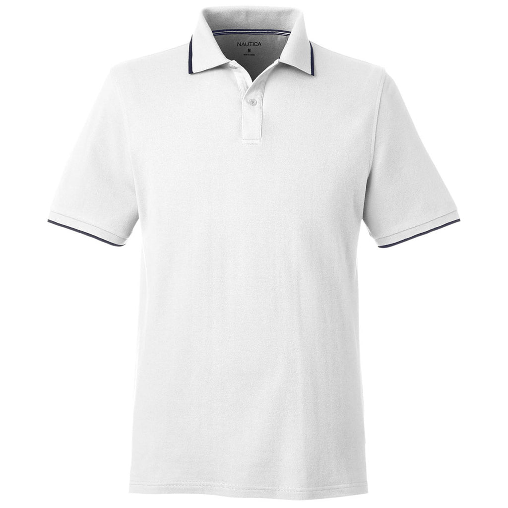 Stand out in a custom Nautica Men's White Deck Polo with stand out striped tipping. This upgraded polo will showcase your company logo whether on the golf course, in the club house, or taking a long business lunch. Made of a cotton and polyester blend with two button placket, short sleeves, and ribbed trim, this is a polo everyone needs as part of their wardrobe. Perfect for employee apparel, but could be layered for a corporate apparel look and feel.