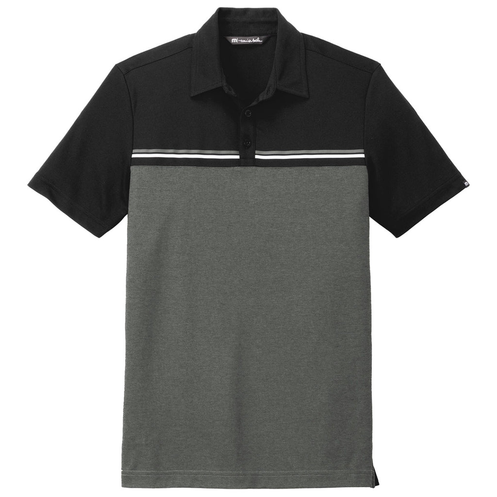 Classic color blocking gives this TravisMathew Men's Black/Dark Grey Heather Sunset Blocked Polo a laidback look that everyone will appreciate. Your company's custom logo or design will make a statement at golf outings and other casual industry events when it's added to this polo, which is made from a 4-way stretch performance fabric.