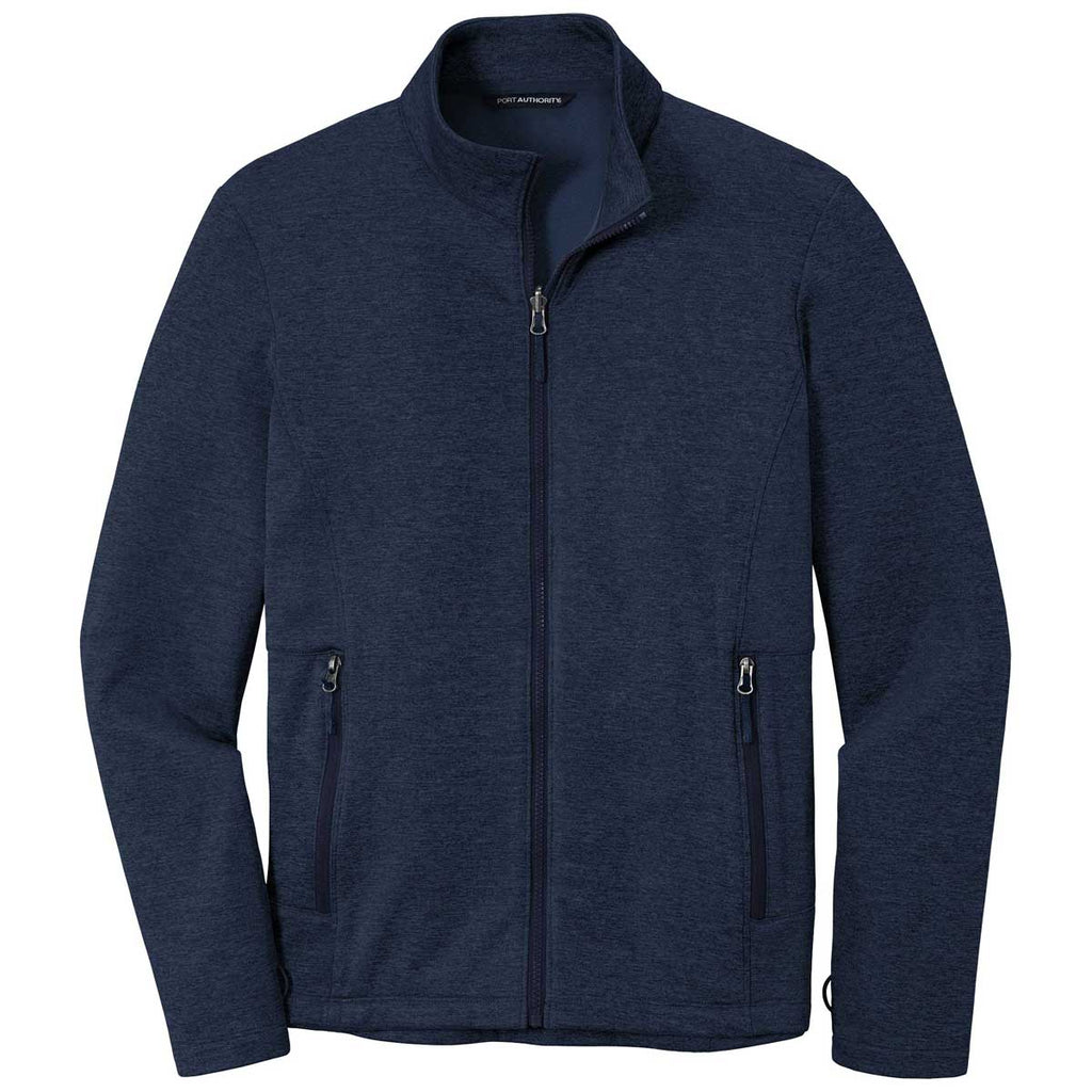 Stand out in a custom Port Authority Men's River Blue Navy Heather Collective Striated Fleece Jacket with full front zip and zippered side pockets. Wear alone or snap into an outer Collective layer for the coldest of days. Made of 100% polyester fleece this jacket can be embroidered with a custom logo to give as a custom gift or simply to add to your logoed apparel line. The slightly longer length adds coverage when working which makes it great as employee apparel with a company logo. Open hem and cuffs create a jacket that moves with you weather hanging with friends, stocking shelves or helping customers.Corresponding Women's Style: Port Authority Women's River Blue Navy Heather Collective Striated Fleece Jacket