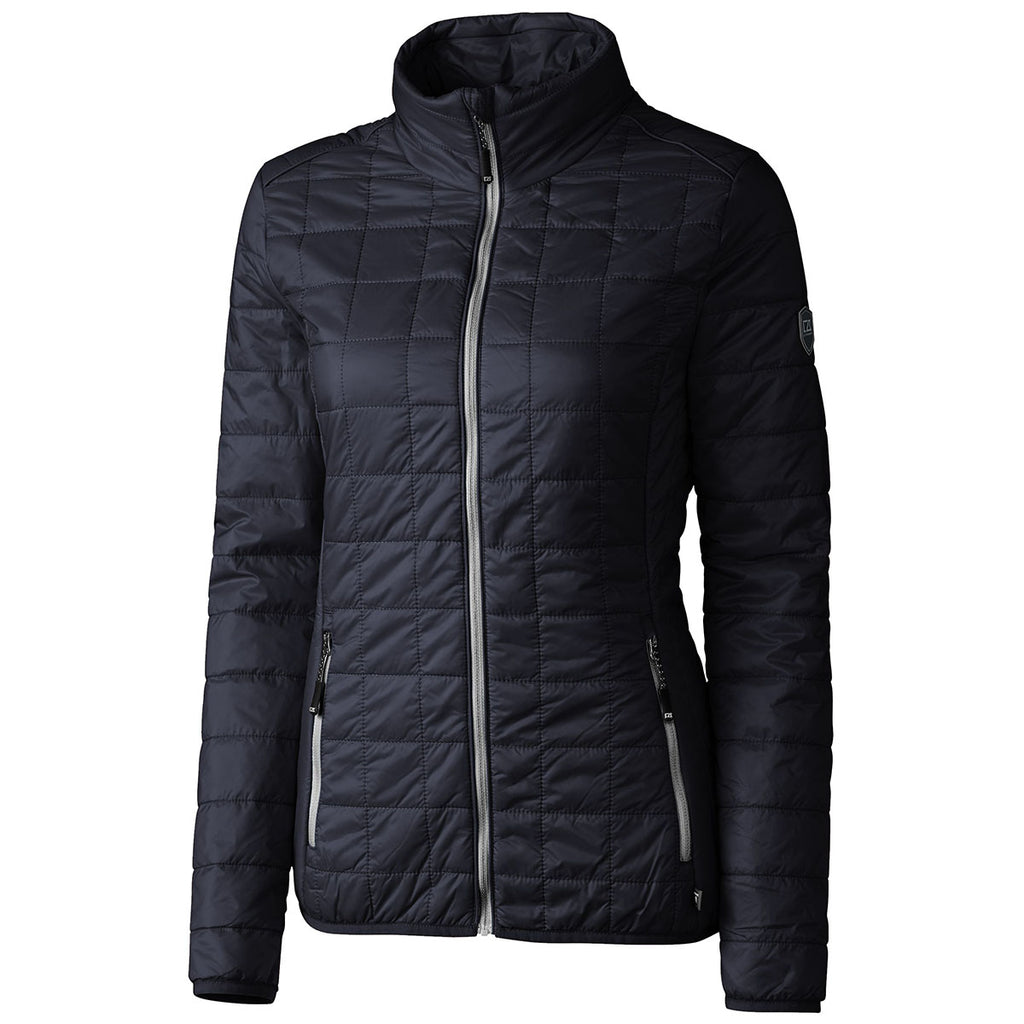 For a ladies' long sleeve jacket that is rated from zero to 50degree, the Cutter & Buck Women's Dark Navy/Silver Rainier Jacket is a great option, especially because your company's logo can be embroidered on it. It is insulted and made from easy-care taffeta. It has a mock turtle neck, full zipper front and front pockets with zippers. It is fully lined with a concealed hood and elastic bound cuffs. For your embroidered logo there is zip in lining for embroidery access. There is Primaloft fill that is packable into the left front pocket. This vest is machine washable in cold water on the delicate cycle.Corresponding Men's Style: Cutter & Buck Men's Dark Navy/Silver Rainier Jacket
