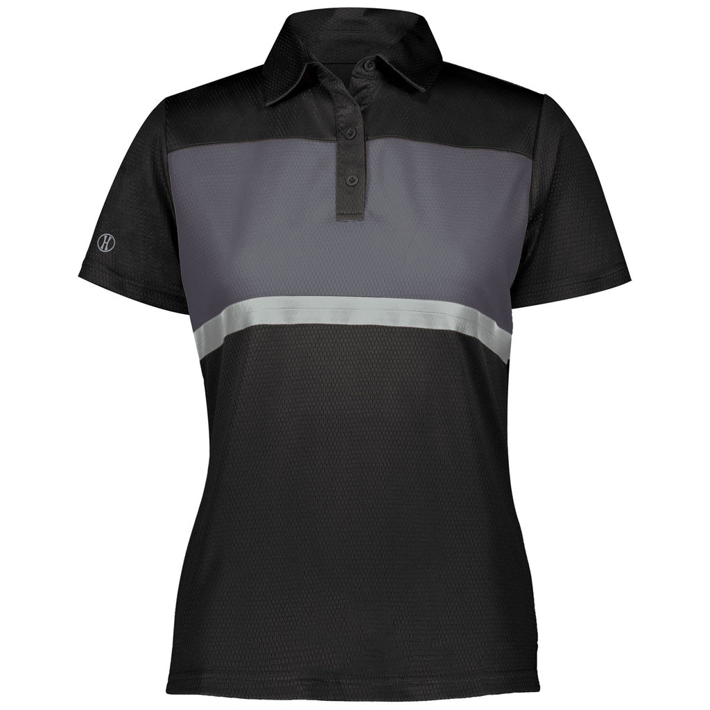 Holloway Women's Black/Carbon Prism Bold Polo with embroidery is a great look as part of uniforms or employee apparel with your company logo. The lightweight polyester wicking honeycomb knit provides a feminine fit with UPF 50+ for added protection. The accents at the chest helps this polo stand out in a crowd and get you noticed. Try out a custom logo to add this polo to your logoed apparel options and watch as they become a popular sales item. The feminine fit with self-fabric collar, three-button placket, and set-in sleeves is a great addition to every wardrobe. Place an order today.Corresponding Men's Style:Holloway Men's Black/Carbon Prism Bold Polo