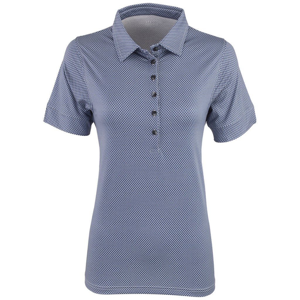 Design a custom embroidery for the Vansport Women's Navy/Grey Pro Eagle Polo to create an easy-to-wear look that is ready for the day. The short sleeve polo is lightweight, anti-microbial, and offers UV protection with an all-over diamond print. Hit the putting green, the back nine, or work in this versatile polo.Corresponding Men's Style: Vansport Men's Navy/Grey Pro Eagle Polo