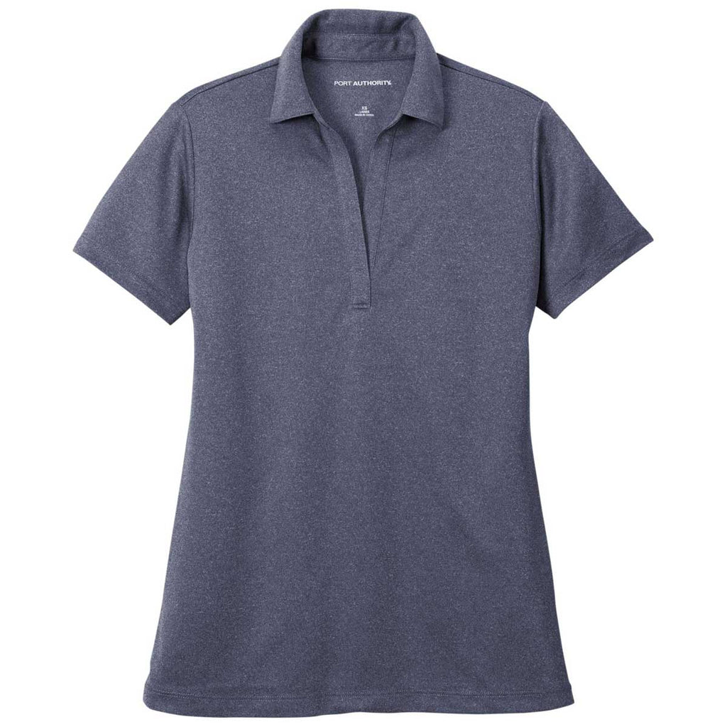 Choose embroidery for the Port Authority Women's Navy Heather Heathered Silk Touch Performance Polo for a custom look that will go anywhere. The popular Silk Touch performance polo expands the options when it comes to creating employee apparel that is fashionable, easy to care for, and professional. Add a company logo to the snag resistant, moisture wicking, V-neck polo with PosiCharge technology. Made of 100% polyester, this V-neck will be an instant favorite for all who get the chance to wear it. Add a custom logo to add to your personal wardrobe or create a logoed apparel line that will fly off the shelves.Corresponding Men's Style: Port Authority Men's Navy Heather Heathered Silk Touch Performance Polo