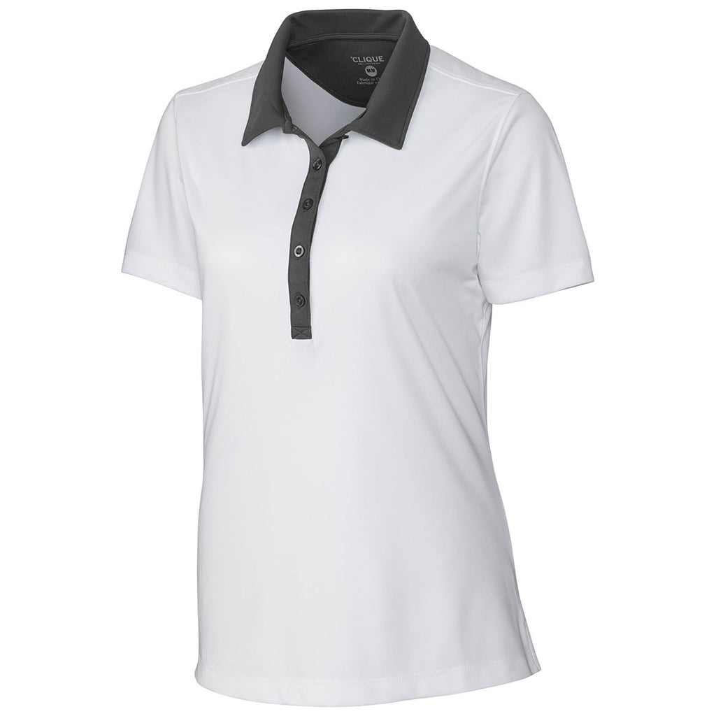 The Clique Women's White/Titan Parma Colorblock Polo offers a stylish design and comfortable fit. When you add your embroidery custom logo to the front, you have a corporate apparel item that you can hand out as employee apparel or distribute at upcoming trade shows and golf events. Available in a variety of eye-catching color schemes, this women's polo shirt also includes wonderful features such as a light 100% polyester fabric, self-collar with four-button placket, and coverstitch detailing. This modern style shirt is sure to be a fan favorite, so be certain to buy this item in bulk!Corresponding Men's Style:Clique Men's White/C Titan Parma Colorblock Polo