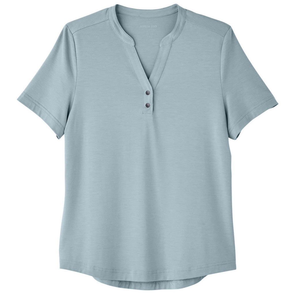 Enjoy the perfect custom look in the North End Women's Opal Blue Jaq Snap-Up Stretch Performance Polo. This comfortable polo is made of a polyester rich, lyocell and spandex jersey that gives a bit of stretch in an active fit. Offering both moisture wicking and antimicrobial performance, this polo is perfect for embroidery for a uniform or general employee apparel. The side vents and hi-low hemline keep workers cool and able to have range of movement whether doing landscaping, serving drinks, or answering phones in the office. The snap closure at the bottom of the slight V-neck adds flair to the overall look. Whether a custom gift or an addition to the logoed apparel you offer, this polo is a must have.Corresponding Men's Style: North End Men's Opal Blue Jaq Snap-Up Stretch Performance Polo