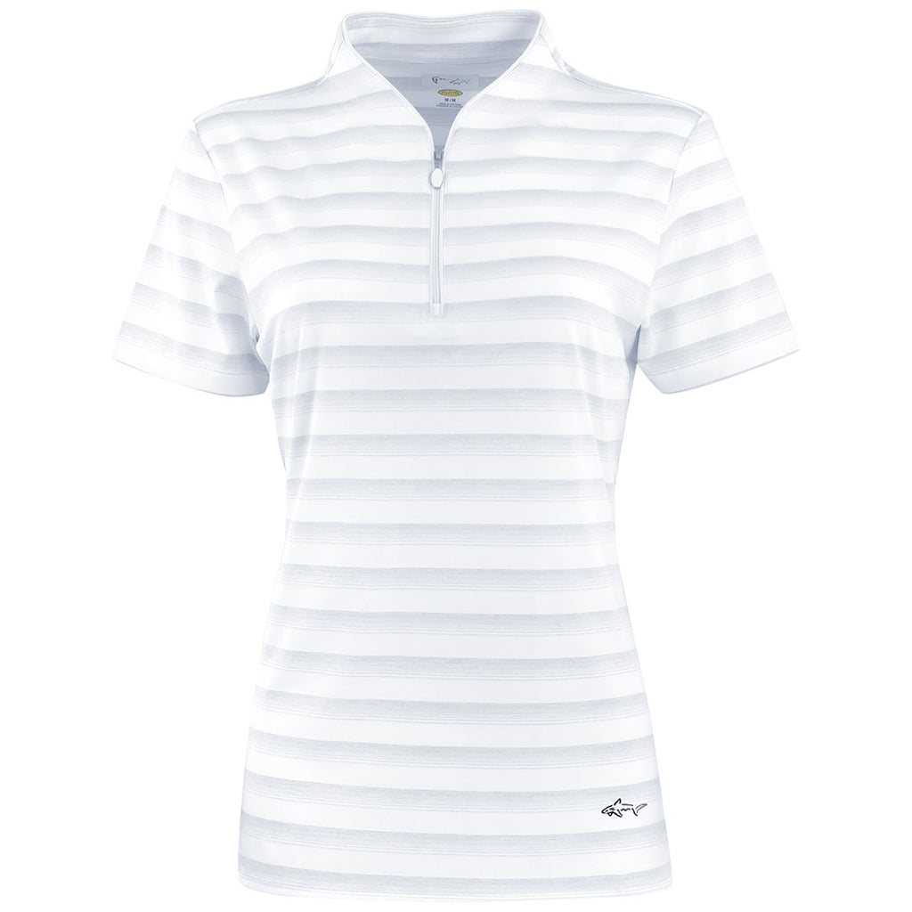 Greg Norman Women's White LAB Stripe Polo with custom embroidery is a fun and fashionable option for whatever your day may hold. The small details of a 1/4 zip neck with piping, performance stretch, and a drop tail hem make this a comfortable choice whether playing tennis, heading to work, or chilling with friends. Order today.Corresponding Men's Style: Greg Norman Men's White LAB Stripe Polo