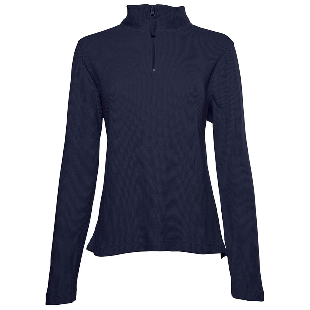 Add a custom logo to the Charles River Women's Navy Waffle Quarter Zip Pullover to create an upscale look that can go almost anywhere. The super soft waffle knit is easy to wear all day. Great for golf, tennis, or general wear, the drop tail hem means you are well covered. Great for seasonal transitions, this pullover can be layered or worn alone for versatility. Place an order today.Corresponding Men's Style: Charles River Men's Navy Waffle Quarter Zip Pullover