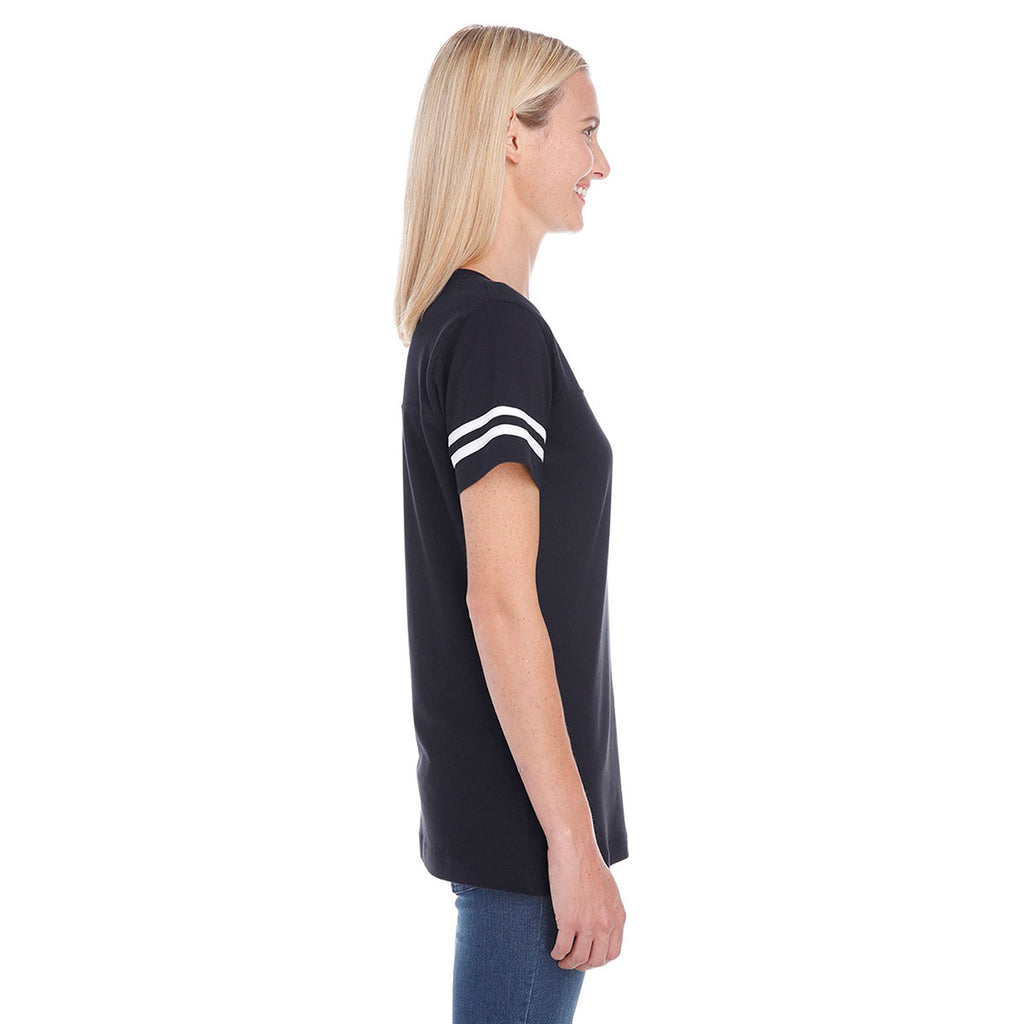 With the addition of your company's custom logo on the LAT Women's Black/White Football Fine Jersey T-Shirt, women can get in the game. The modern V-neck design is accentuated with a series of small stripes on the sleeves, offering a playful design that will make your logo memorable. The ribbed V-neck collar is a comfortable and flattering design element that your female employees will appreciate. With your brand's custom logo, this shirt is the ideal choice for any company athletic league or recreational event.Corresponding Men's Style: LAT Men's Black/White Football Fine Jersey T-Shirt