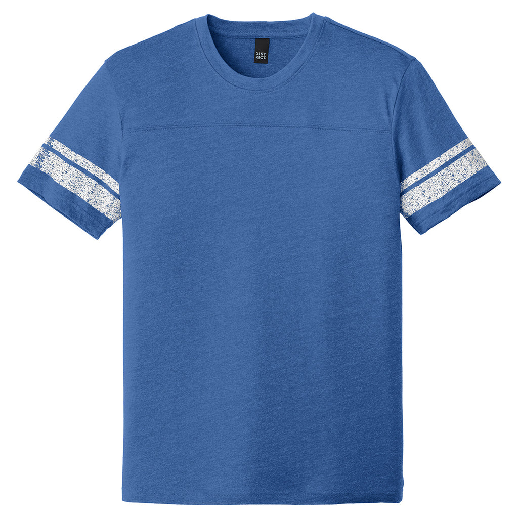 Distressed printed stripes on the sleeves of the custom logoed District Men's Heathered True Royal/White Game Tee will attract the attention of everyone you meet at civic events. Make the buzz pay off for your brand by attaching your company logo on the large imprint area. With a logo, you benefit from a cost effective way to advertise your products and services. The old school look of the tee works well at casual corporate social events. Ring spun cotton combines with highly durable polyester to give you the perfect corporate apparel for the male members of your team.Corresponding Men's Style: District Made Women's Heathered True Royal/White Scorecard Tee
