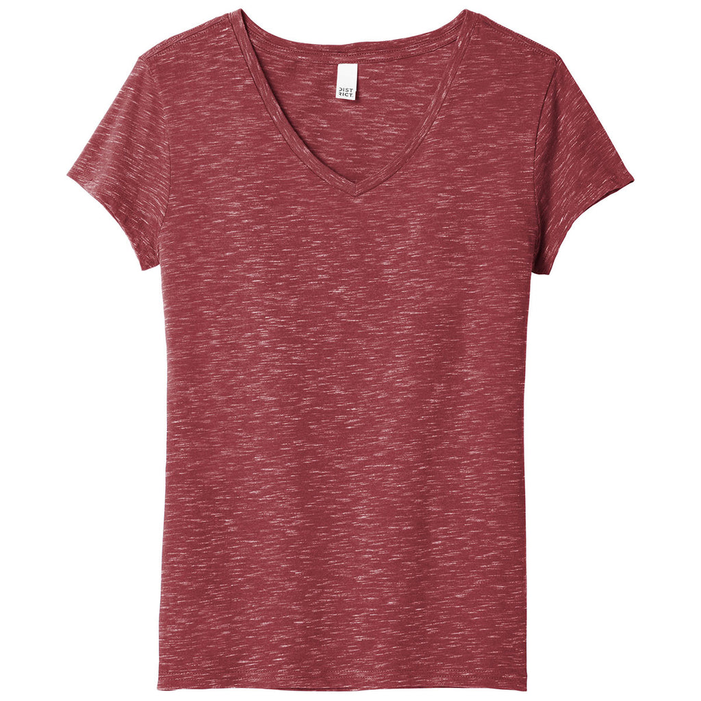 With a relaxed fit that blends in seamlessly at company casual social events, the screen printed District Women's Cardinal Medal V-Neck Tee is an excellent addition to new employee gift bags. Shoulder to shoulder taping produces a structured look that withstands the pounding delivered by active lifestyles. Enjoy the super smooth feel of 90% ring spun cotton, as well as polyester fibers that bind together to resist rips and tears. Wear the tee as an only layer at a picnic and as the first layer of a cool weather fashion ensemble. Attach your corporate logo for getting more exposure at industry trade shows.Corresponding Men's Style: District Men's Cardinal Medal Tee