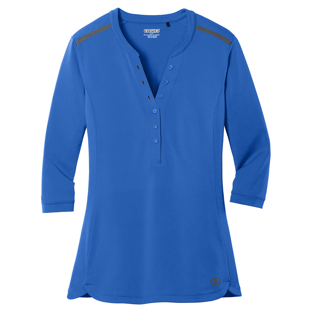 Perfect to wear at business conferences or company events, the embroidered OGIO Women's Optic Blue Fuse Henley long sleeve shirt combines long lasting performance and a chic appearance making it perfect for any occasion. Great for layering with a sweater or jacket. This shirt will be a nice addition to your wardrobe for both days at the office and after hours. Make sure you reach customer prospects by displaying the custom logo attached on the large imprint area. Your employees will be happy to receive a new and stylish piece of corporate apparel.
