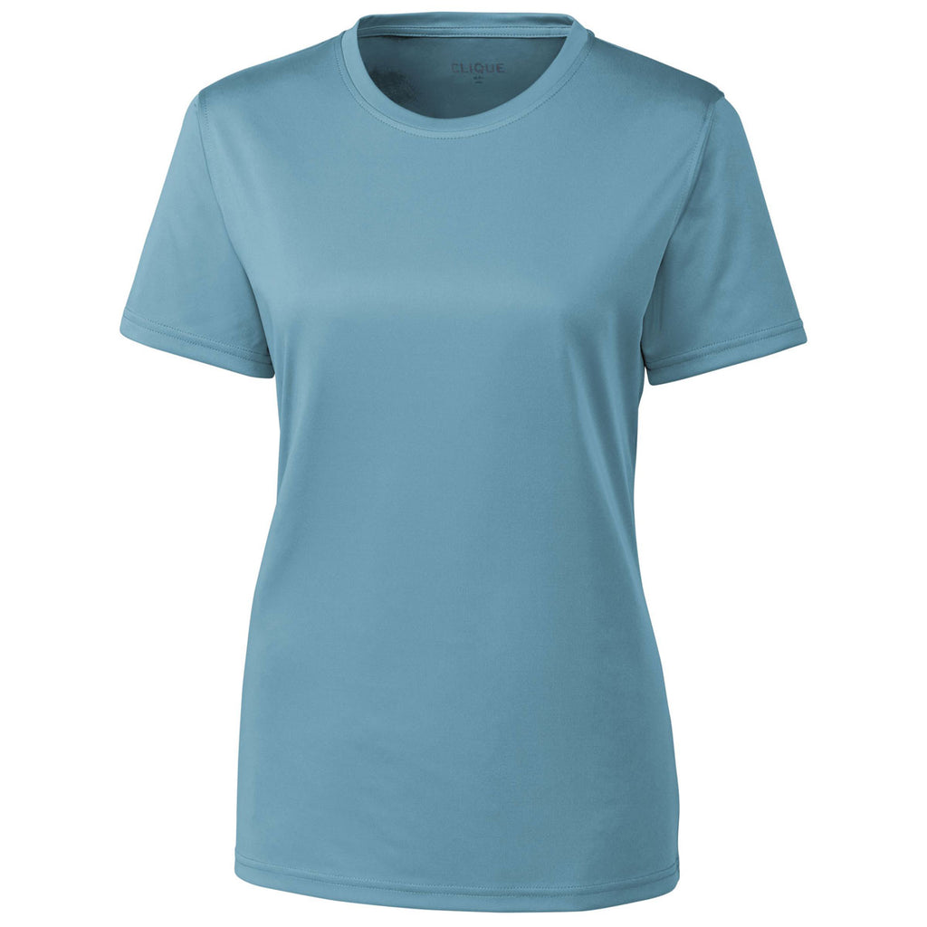 At the next company sponsored golf tournament, hand out the Clique Women's Dusty Blue Spin Jersey Tee to the female members of your accomplished team. Long lasting color makes the tee perfect for frequent use in a wide variety of competitive athletic events. Designed with 100% spin-dye polyester interlock, the tee handles all of the punishment thrown at it. Add a custom logo to send the message your company stands behind high quality products and services. Open sleeves allow you to rear back and let it rip from the tees and fairways. Self-fabric neck trip adds panache to an already fashionable short sleeve shirt.Corresponding Men's Style: Clique Men's Dusty Blue Spin Jersey Tee