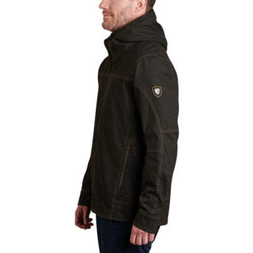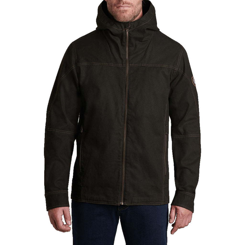 Design an embroidery for the KUHL Men's Espresso Law Hoody for a heavy duty look that is up for the hard work you do each day. Add a company logo to the durable, stretch canvas hoody to use as employee apparel that is tough enough for almost every job. The rugged reliability of this hoody is what makes it a preferred choice by many. The generous cut allows for layering to accommodate for varying weather as every day work wear. The connected hood zips to chin level for added protection against the elements whether you are at work, out on a hunt, or hiking for enjoyment. Place an order today to have these as part of your logoed apparel line.Highlights