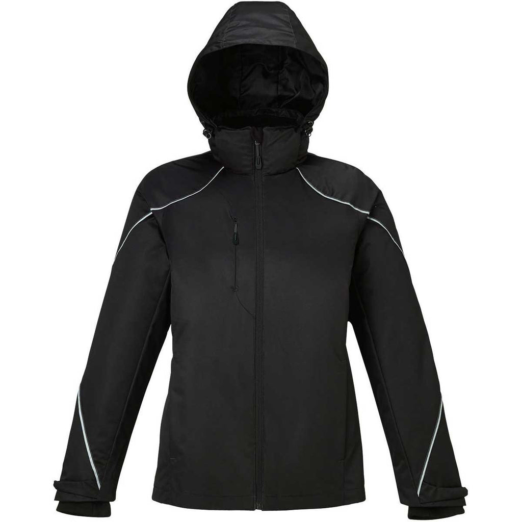 One-hundred percent polyester twill provides the best of both fashion worlds for the North End Women's Black Angle 3-In-1 Jacket with Bonded Fleece Liner. Highly durable polyester keeps this jacket in mint condition for years to come, while the soft twill enhances your comfort zone. Wear this jacket outdoors during a long walk or at the office to impress professional peers. Contrast stitching on the flat reflective piping accentuates the already stylish North End Women's Black Angle 3-In-1 Jacket With Bonded Fleece Liner . A custom logo added to the jacket boosts your company's profile in the community. With a corporate logo attached to the large imprint area, you create the perfect company gift for high achieving employees and loyal patrons of your business.Corresponding Men's Style: North End Men's Black Angle 3-In-1 Jacket with Bonded Fleece Liner