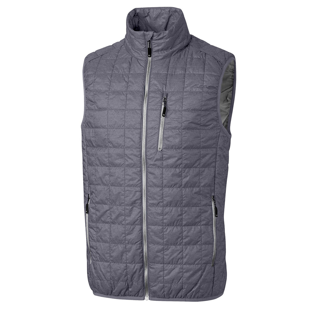 Stay warm with the Cutter & Buck Men's Anthracite Melange Tall Rainier Vest. With the addition of your company logo, this vest is the perfect way to market your company in a fashionable way. The vest has a full-length zipper at the front plus a smaller zipper near the middle for a breast pocket space. Added zippers are included for traditional hand pockets on both sides. The surface comes with a padded nylon feature with taffeta insulation to keep you warm. The brilliant and soft surface adds a comfortable space for any special outing of interest to you. Try this out for a special winter event or other cool-weather activity at your business. This is a nice prize for company events in the winter. Don't forget to add a brilliant custom logo on the surface.Highlights