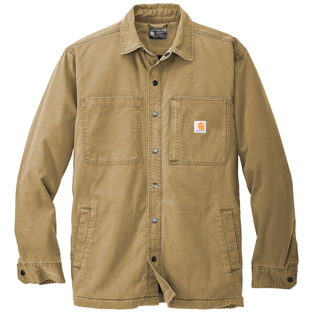 Carhartt Men's Dark Khaki Rugged Flex Fleece-Lined Shirt Jac with your custom logo design is the workwear option most everyone will love. Built Carhartt tough, this jac has a printed fleece lining, and Flex technology for ease of movement. Great for those who work outdoors as farmers, contractors, or in other professions. Place an order today.This product can only ship within the United States and Canada.