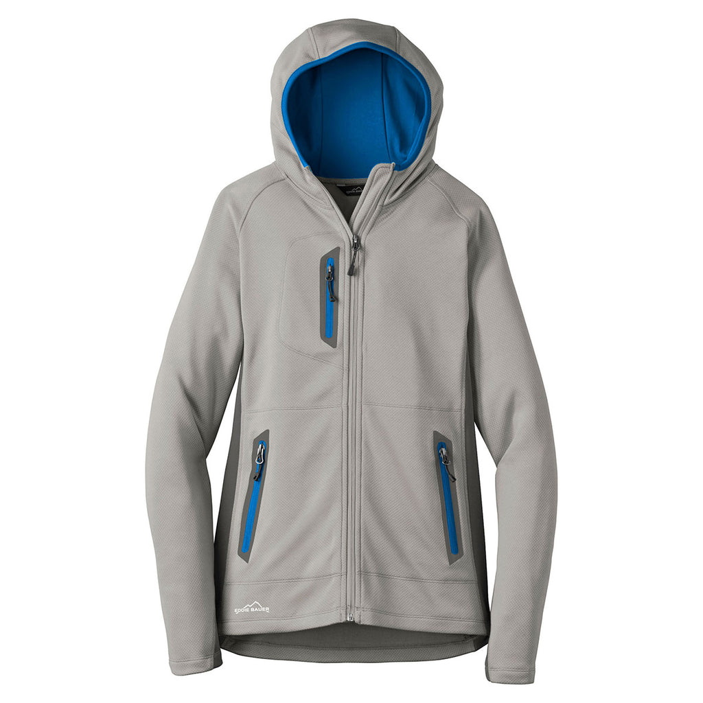 With a logo, you transform the Eddie Bauer Women's Grey Cloud/Grey Steel/Expedition Blue Sport Hooded Full-Zip Fleece Jacket into the leader among corporate issued jackets. Your company logo gets the word out about your brand at industry sales conferences. The medium weight jacket contains smooth faced fleece to deliver optimal comfort for every outdoor adventure. Rugged polyester resists the types of rips and tears caused by continued use. The welded zippered chest pocket gives you quick access to camping accessories and electronic devices. Give the thermal jacket to the members of your corporate team as a way of saying thank you for their hard work.