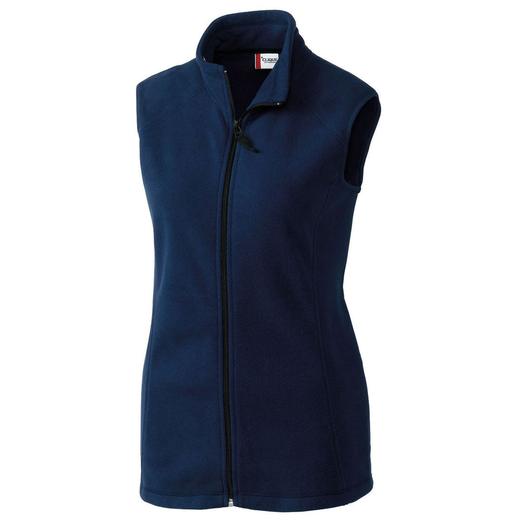 Take company apparel style to the next fashion level by ordering the Clique Women's Navy Summit Full Zip Microfleece Vest for the women on your high achieving team of professionals. Spandex trimmed armholes allow you to let it rip when you tee off at the next corporate sponsored golf tournament. Add a custom logo on the embroidery area to associate your company with high quality products and services. The 100% polyester microfleece vest resists rips and tears to give you active wear that lasts for years to come. Raglan piecing creates a geometrically stunning vest to wear for all occasions.Corresponding Men's Style:Clique Men's Navy Summit Full Zip Microfleece Vest