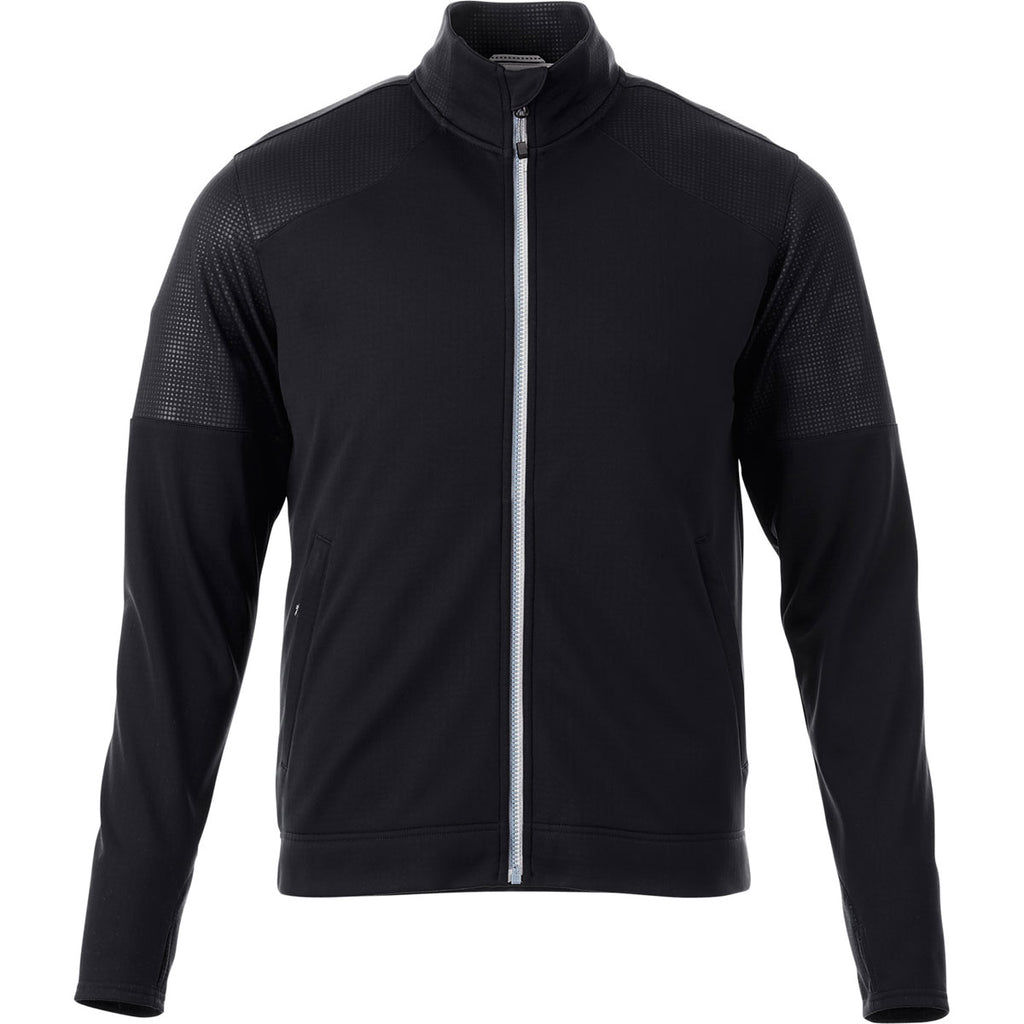 Elevate Men's Black Senger Knit Jacket lets you hit the gym or office even in cold weather. Run errands or run a company in style with a custom embroidery knit jacket by Elevate. With graphic shoulder detailing, sleeve cuffs with thumb exits, and earbud cord guide and exit, this jacket offers it all. Available in five different colors and a range of sizes, a custom logo can be placed on this polyester interlocking knit. Choose a company color and offer these jackets as employee apparel or give as corporate gifts to clients. Appropriate for most activities in or out of the work environment. Order yours today!Corresponding Women's Style: Elevate Women's Black Senger Knit Jacket