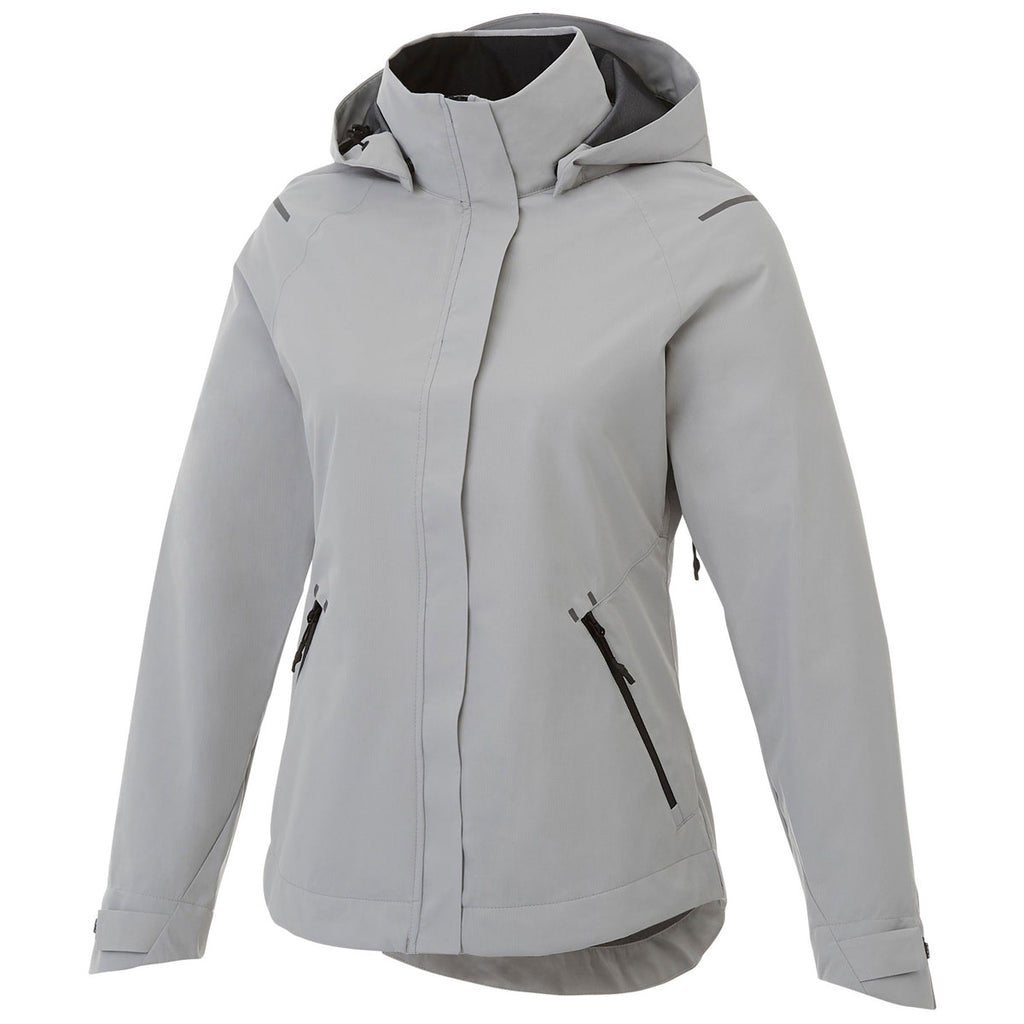 Add a custom logo to the Elevate Women's Fossil Gearhart Softshell Jacket to create a look that will be ready to go wherever you want. This ultra-lightweight jacket is waterproof and breathable with critical seam sealing and a snap off hood. The three layer construction offers soft brushed tricot against your skin and a sleek outer layer to keep you dry. Create rain gear for any occasion with a little something extra like a custom logo. Try a company logo to use as employee apparel or gifts for any occasion. Perfect for those who need something easy to layer and get on and off with the front zip and side zippered pockets.Corresponding Men's Style:Elevate Men's Fossil Gearhart Softshell Jacket