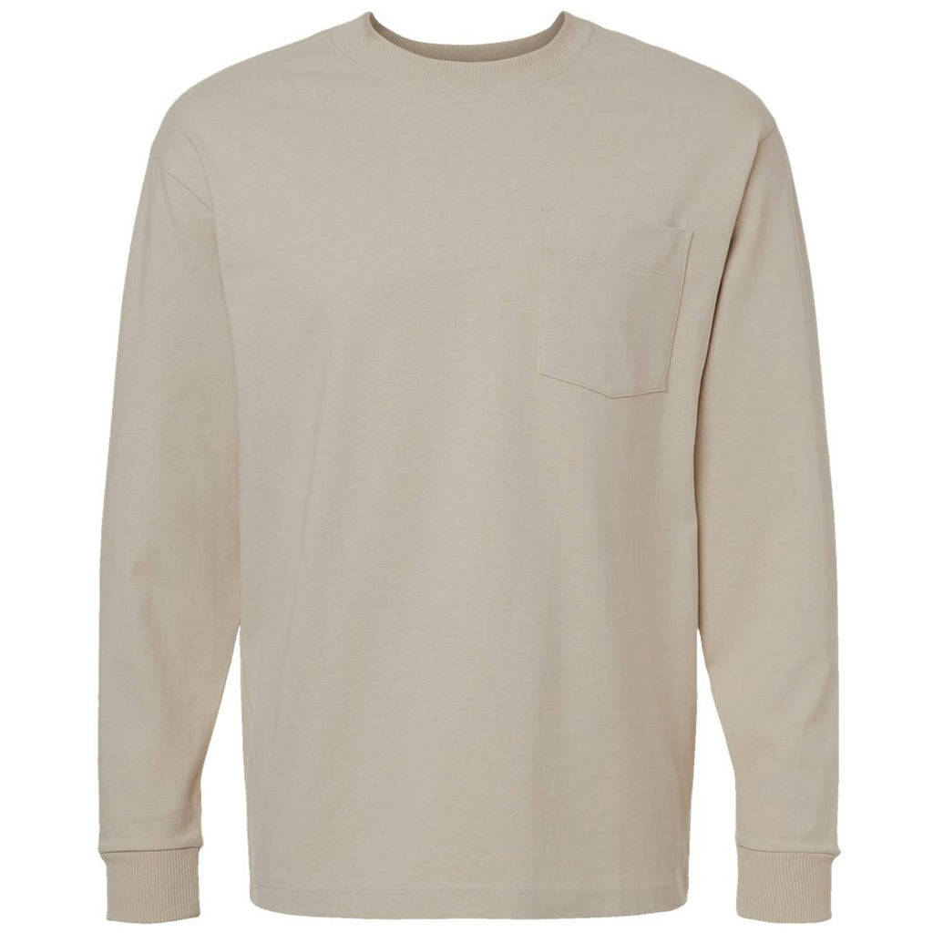 American Apparel Unisex Bone Super Heavyweight Long Sleeve Pocket Tee with a custom logo offers an oversized fit that keeps you comfortable all day long. The relaxed-fitting tee is a must-have for layering and relaxing, whether that means playing a pick-up game of basketball, working out, or just chilling as you watch the big game.Highlights