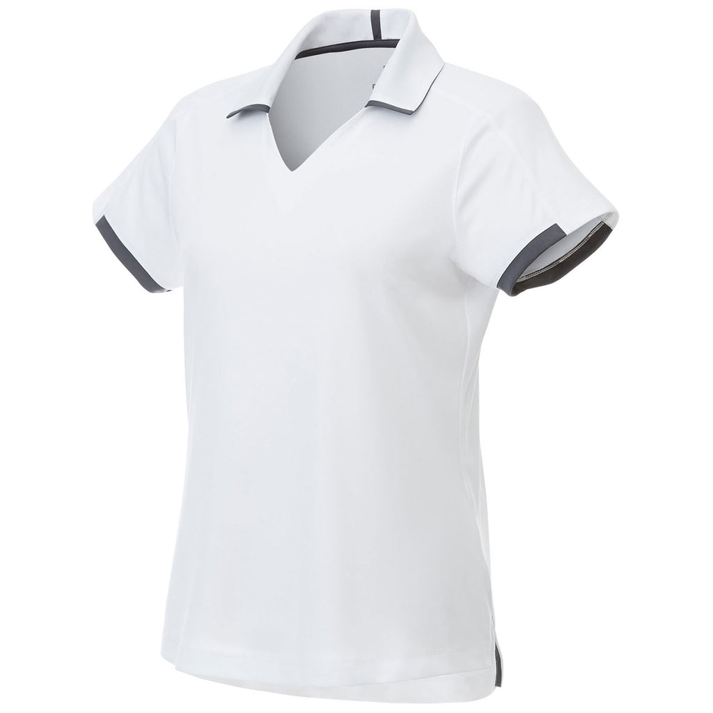 Add embroidery to the Elevate Women's White/Grey Storm Cerrado Short Sleeve Polo for a look all your own. This polo is not just a basic run of the mill polo with styling and contrast details that make it unique. The shaped seams, tapered waist, V-neck, and dropped back hem create a silhouette that all can appreciate. Add a company logo to enjoy employee apparel that is snag resistant, moisture wicking and made to be washed and worn repeatedly while still looking good. Create your own unique logo to start building your logoed apparel line for a shop or store with this polo that is sure to be a best seller.Corresponding Men's Style:Elevate Men's White/Grey Storm Cerrado Short Sleeve Polo