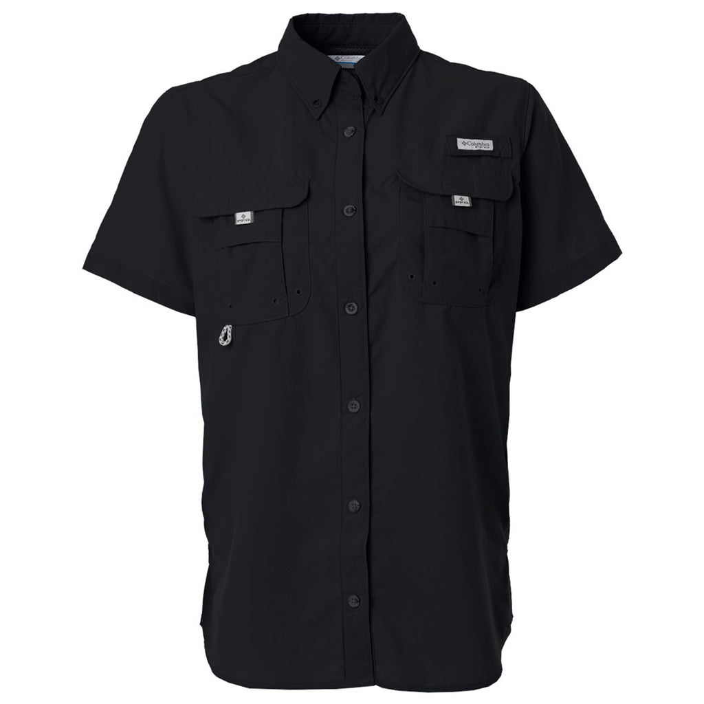Choose a corporate logo for the Columbia Women's Black PFG Bahama Short Sleeve Shirt made of Tactel nylon. This shirt is ready for hard work and adventure with broad spectrum UPF 50 sun protection, quick-dry technology, a rod holder, and a utility loop. The vented shirt keeps you cool, whether hunting, fishing, or working all day.This product cannot ship outside of the United States.