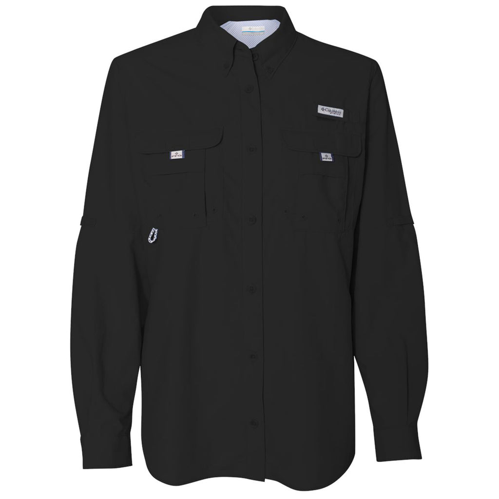 Columbia Women's Black PFG Bahama Long Sleeve Shirt with embroidery is a durable way to enjoy being outdoors. The 100% Tactel nylon is tough yet comfortable for all-day wear. Made with Omni-SHADE UPF 50 sun protection and quick dry technology with a vented back, this is a must-have for those who work and play hard.This product cannot ship outside of the United States.