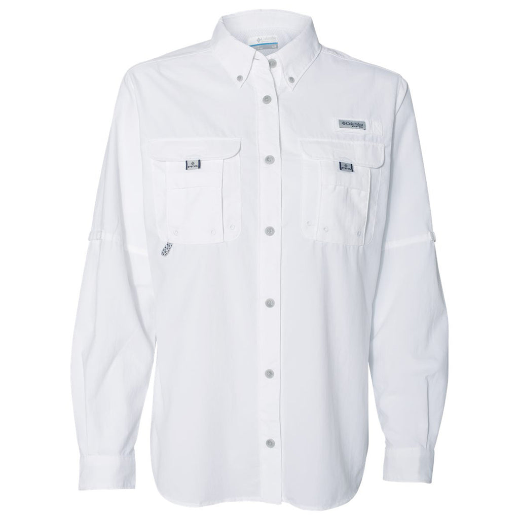 Columbia Women's White PFG Bahama Long Sleeve Shirt with embroidery is a durable way to enjoy being outdoors. The 100% Tactel nylon is tough yet comfortable for all-day wear. Made with Omni-SHADE UPF 50 sun protection and quick dry technology with a vented back, this is a must-have for those who work and play hard.This product cannot ship outside of the United States.