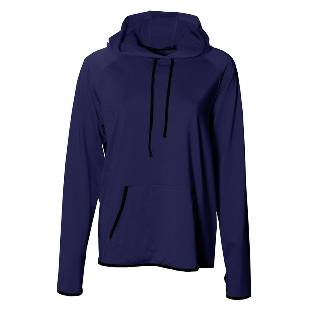 Women like hoodies that are fashionable as well as comfortable. When you have a custom logo on the BAW Women's Navy Comfort Weight Hood you will have some very happy women. Because it is made with polyester and spandex, it moves when you do and stretches as you stretch. Yet it goes back to its original shape. This hoodie has a bi-color design and front pockets for convenience. It also has thumbholes. Sizes range from XS to 2X in an assortment of colors. Your women can be comfortable as well as chic.Highlights