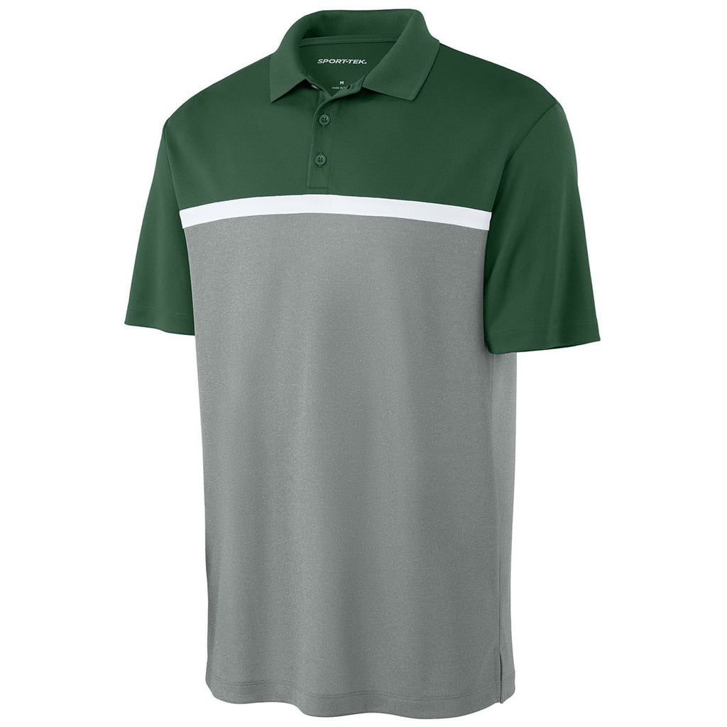 A custom Sport-Tek Men's Forest Green/Grey Concrete Heather/White UV Micropique Colorblock Polo combines style and performance in a lightweight, breathable design. With built-in UV protection, this polo shields you from the sun while keeping you cool and comfortable. Its colorblock design adds a modern touch, making it perfect for athletic and casual wear, no matter the occasion.Highlights