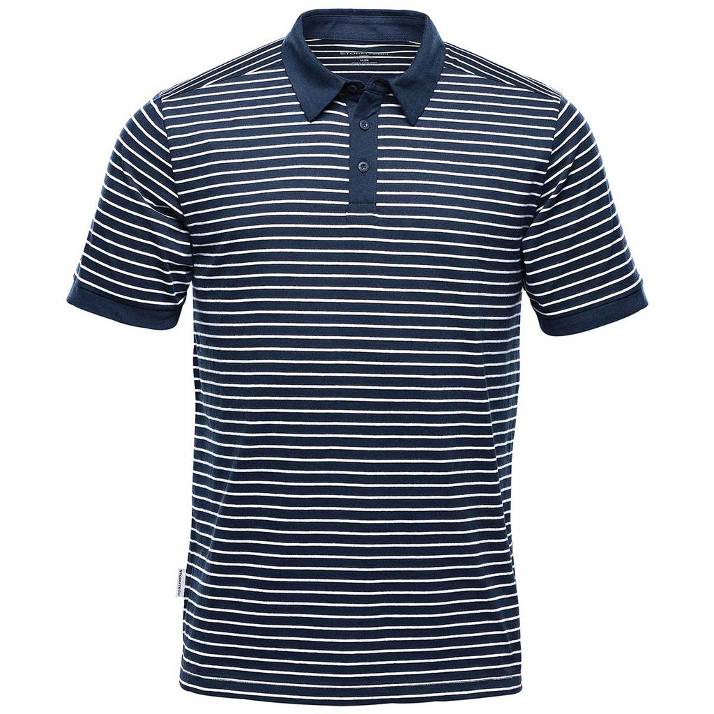 Stand out in a custom Stormtech Men's Navy/White Railtown Polo with stripes. The contrasting sleeves and collar on this classic polo style add to the uniqueness of the overall piece. A year round basic, this polo can be dressed up as corporate apparel or dressed down for an evening with friends. Add a company logo to use as employee apparel that is clean and professional while remaining comfortable. Ideal for the golfer in your life, this polo would look great on the course or driving range.Highlights