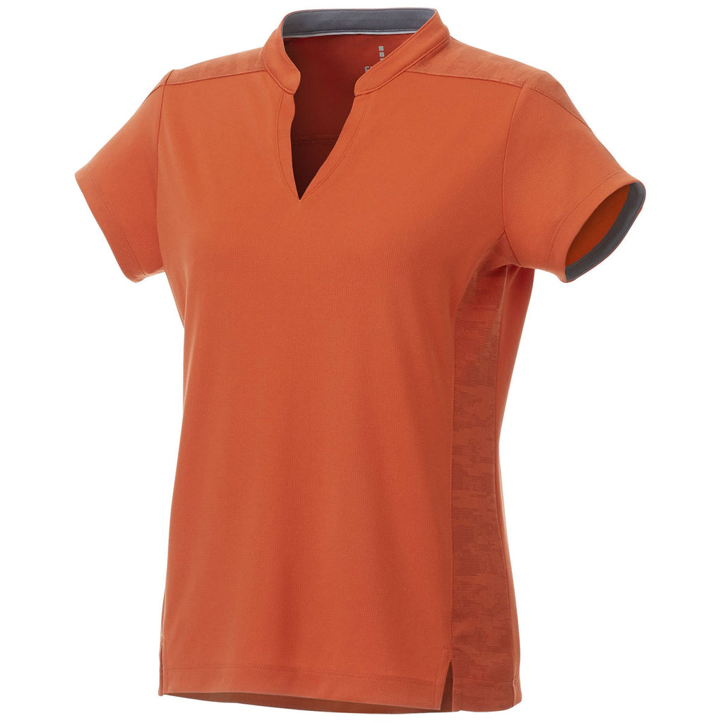 Add a custom logo to the Elevate Women's Saffron Piedmont Short Sleeve Polo that has a subtle graphic and reflective details. This stylish polo offers a hidden button placket, shaped seams, a tapered waist, and sleek stand collar for a silhouette that any woman can love. Don't let the details fool you, this polo also offers moisture-wicking, snag-resistance, UPF 40+, and wash and wear performance which makes it perfect as employee apparel or employee gifts when a company logo is added. The polyester double knit birdseye mesh knit will stand up to many days of work and play.Corresponding Men's Style:Elevate Men's Saffron Piedmont Short Sleeve Polo