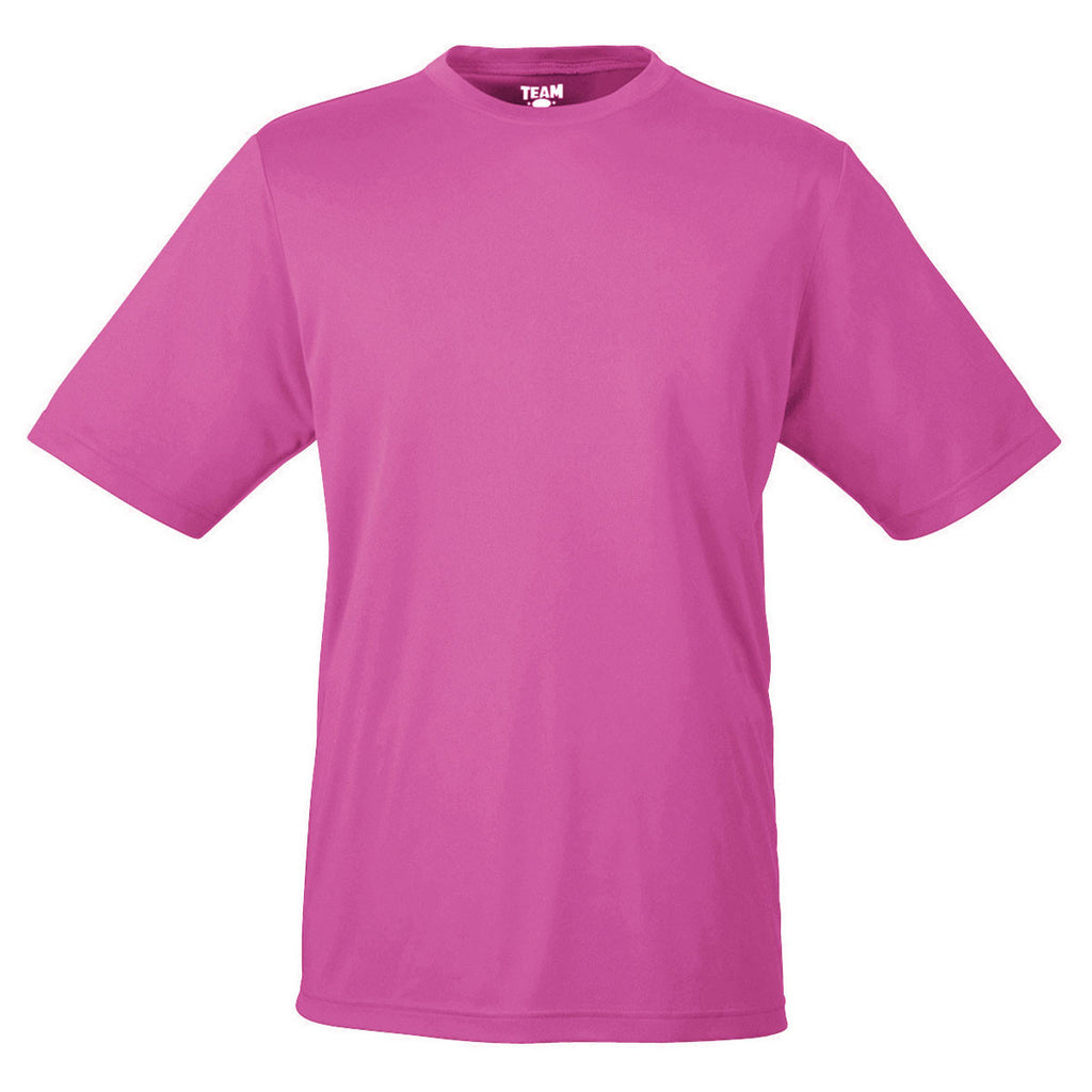 One-hundred percent polyester interlock makes the Team 365 Men's Sport Charity Pink Zone Performance T-Shirt the go to shirt for serious athletes. Ultraviolet ray protection performance prevents skin damage caused by prolonged exposure to the sun. The snug, yet comfortable athletic fit gives you a leg up on the competition. Bright cationic dyes create a stunning visual appearance that leaves a long lasting impression on the other team. Add a custom logo to the large imprint area to bolster the image of your company at corporate sponsored sporting events. Logoed corporate apparel makes ideal gifts to reward the hard working members of your team.Corresponding Women's Style: Team 365 Women's Sport Charity Pink Zone Performance T-Shirt