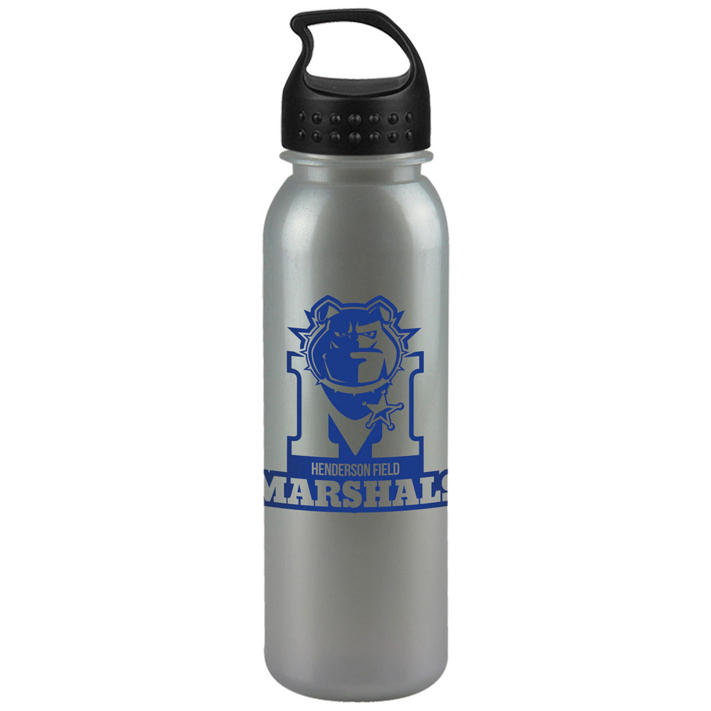 Choose a fun custom logo for the Good Value Silver Terrain Metalike Bottle - 24 oz. for an easy way to carry and enjoy your drink as you go about your day. The screw on top for this large bottle with a place to add a carabiner clip for easy attachment to a bag means you can take this bottle running, hiking, or biking with ease. Add a company logo to give this as a welcome gift to a new employee, friends, family, or clients. The metal like outer coating creates a smooth surface for the design and helps keep drinks cool for longer. Place an order right away because these will go quickly.