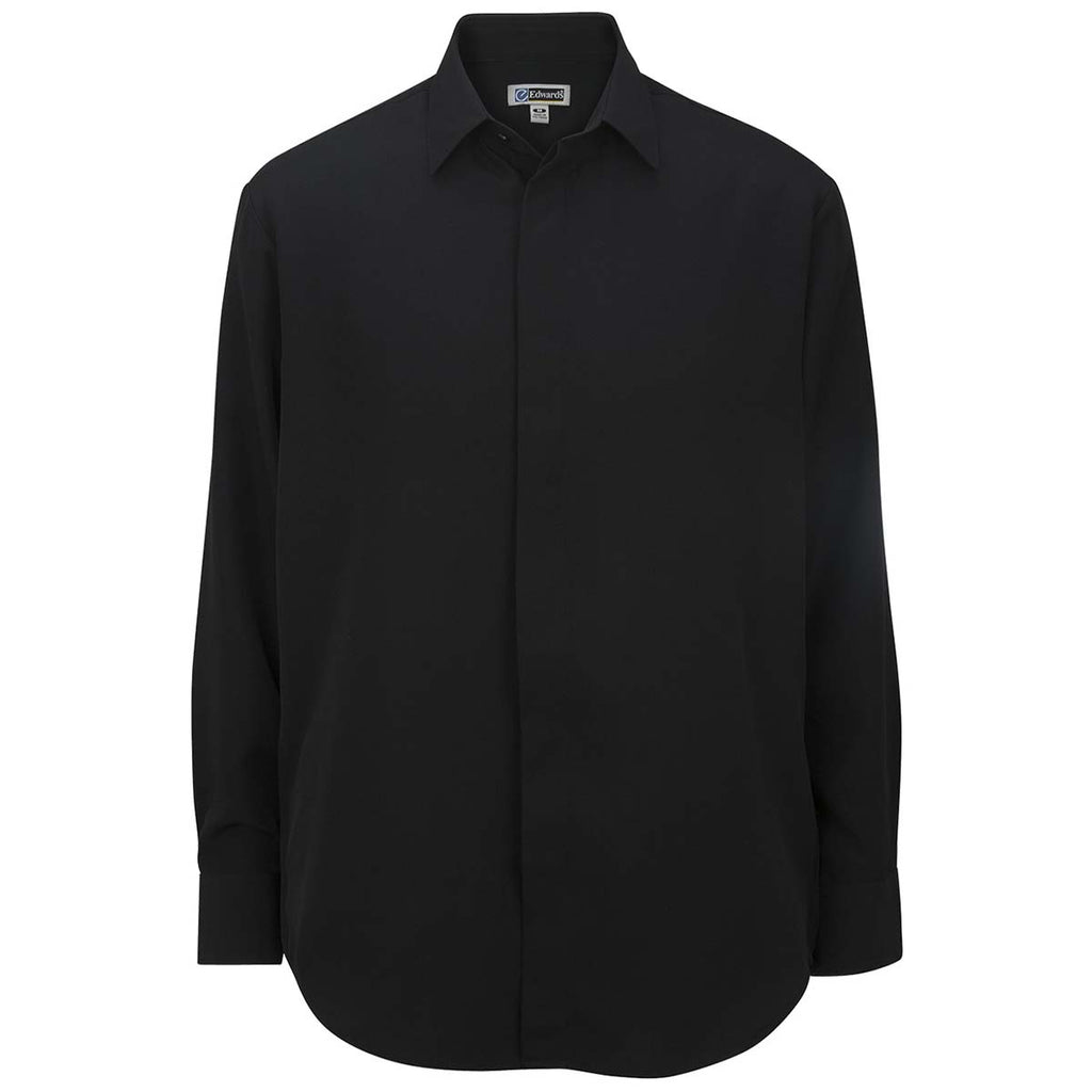 Create a custom updated look with the Edwards Men's Black Batiste Cafe Shirt in a range of classic colors. Offering a modern fit in an understated style, this 100% polyester shirt is perfect for those who need employee apparel that demonstrates professionalism. Add a corporate embroidery to the long sleeve button up with chest pocket and narrow collar with hidden placket. Ideal for layering with a suit jacket as part of corporate uniforms the shirt is wrinkle resistant, offers soil release, and moisture wicking. Your custom logo will look beautiful on these shirts that offer the ability to be paired with jeans, slacks, or almost any type of attire you can imagine.Highlights
