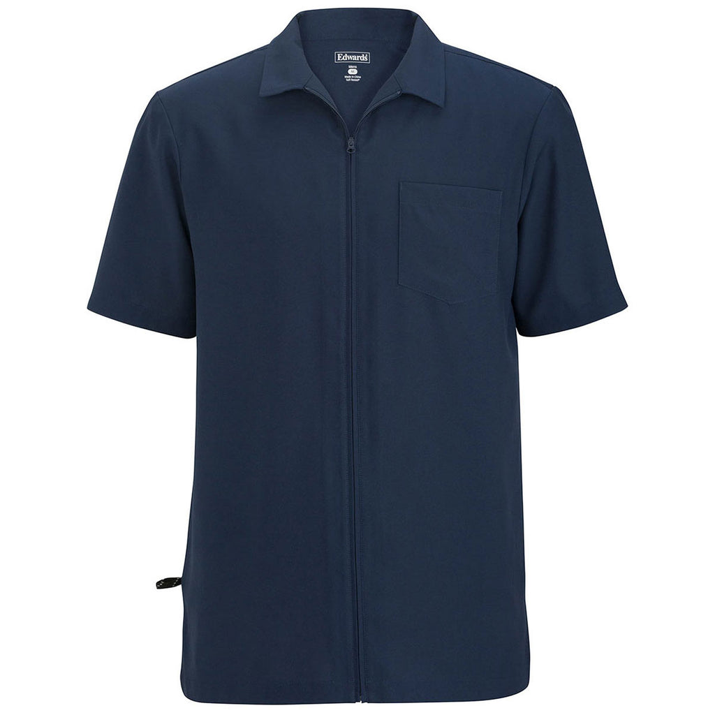 Edwards Men's Bright Navy Essential Soft-Stretch Service Shirt in java with a custom embroidery is the gift or uniform you have been searching for. The 100% soft-stretch polyester is lightweight with a traditional fit. Made with stretch, this shirt allows for plenty of movement whether cooking a five-star meal or greeting new clients at the front desk. The full front zipper makes it easy to layer this shirt over a tank or tee while still looking extremely professional. Add a company logo to the Scotchguard protected fabric that has soil release to give as employee gifts or something special to a friend.Highlights