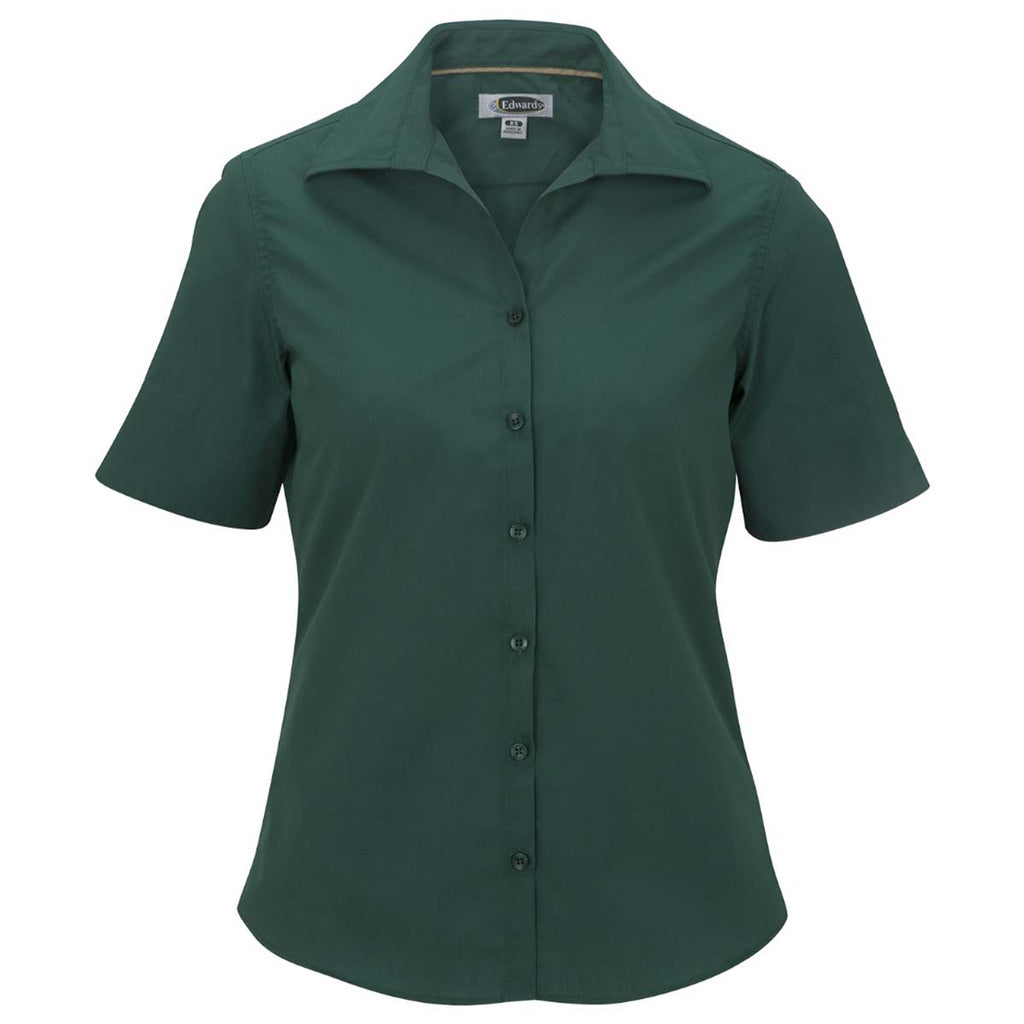 A custom dress shirt look with a comfortable feel comes together with the Edwards Women's Hunter Lightweight Short Sleeve Poplin Blouse. Made to stand up to the demanding wear of customer service or restaurants, these make great employee apparel for those that work the hardest. Add a custom logo and choose the color you like best as hospitality apparel. Made of polyester and cotton, this short sleeve shirt with matching buttons, countered seams, and open neck this shirt can easily go from the office to the sales floor and anywhere in between. Choose the color and embroidery you like best and place an order.Highlights