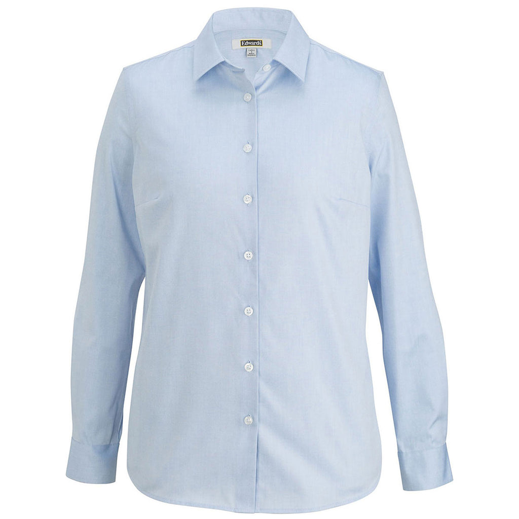 Choose your embroidery for the Edwards Women's Light Blue Pinpoint Oxford to enjoy a lightweight professional look that will turn heads. The tailored fitting oxford offers light stripes for an eye-pleasing look. Add a company logo to use as corporate apparel or as employee apparel that will have employees looking polished and professional. The wrinkle free fabric looks great even when your hours are long and the spread collar has permanent stays to maintain appearances. Princess back seams and a curved hem on the machine washable oxford gives this long sleeve shirt a feminine flair that can be worn alone or paired with a sweater or blazar.Highlights