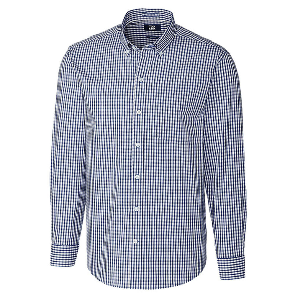 The Cutter & Buck Men's Liberty Navy Tall Long Sleeve Epic Easy Care Stretch Gingham Shirt makes a unique and fashionable canvas for your company's logo. The details make it look great on its own, although the shirt also works alongside a vest or other item you may use for a corporate uniform. The comfortable design includes a chest patch pocket, double pleats around its surface, and a button-down collar. The cuffs on the sleeves keep them intact without them riding up on anyone's arms. Order this as a professional outfit for anyone in the workplace to sport anywhere in the office.Highlights