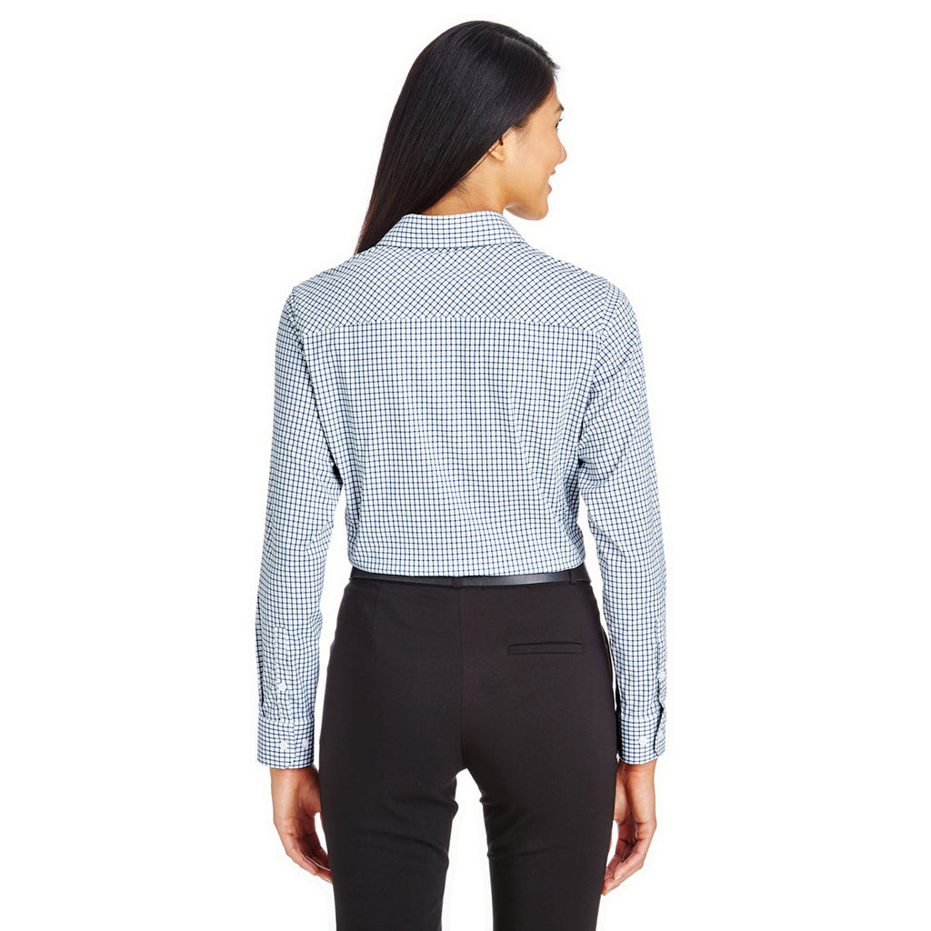Front and back princess seams designed for the embroidered Devon & Jones Women's Navy/White CrownLux Performance Micro Windowpane Shirt create a flattering fit. Wear the versatile long sleeve shirt to work and keep it on after work when you kick back with colleagues at your favorite restaurant. The stylish shirt is an excellent way to welcome new employees. Just remember to add your company logo on the large imprint area to expand awareness of your brand at business seminars. The nylon and spandex blended fabric stretches to give you maximum arm movement flexibility.Corresponding Men's Style: Devon & Jones Men's Navy/White CrownLux Performance Micro Windowpane Shirt