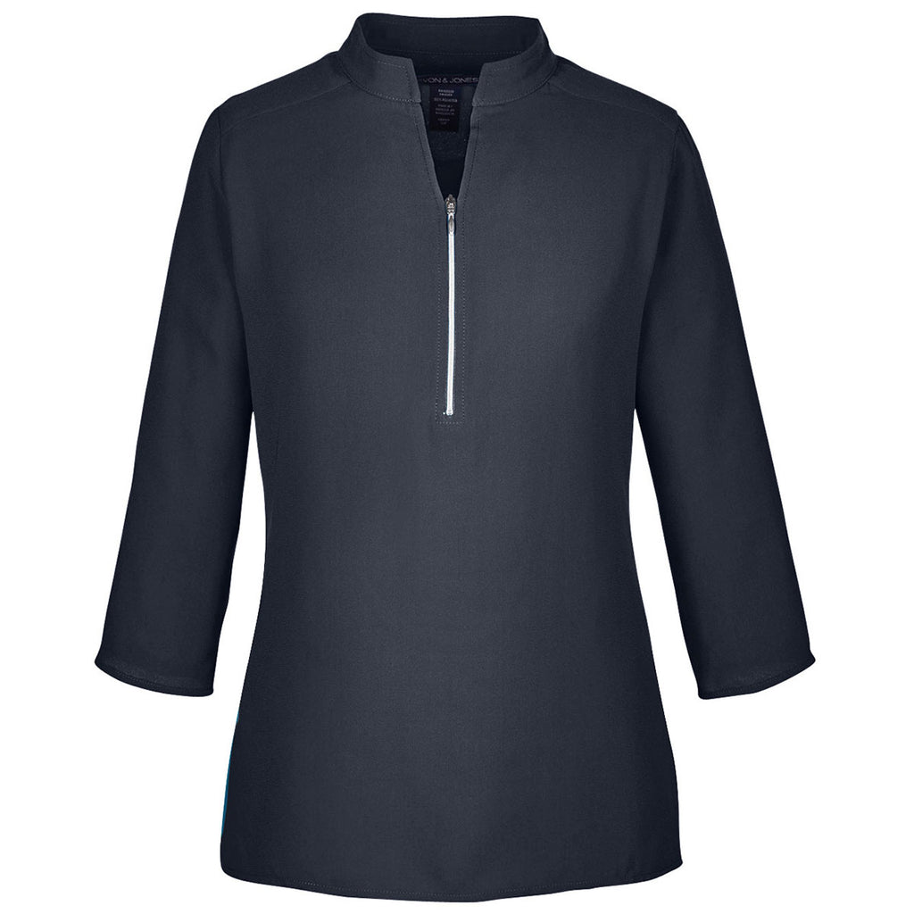 Try out a custom logo on the Devon & Jones Wome Black Perfect Fit 3/4-Sleeve Crepe Tunic for a unique form of employee apparel that will stand out. Add a company logo to the 100% polyester crepe tunic to allow guests to easily identify those in charge and seek services as needed. The center front metal zipper has an auto-lock teardrop slider and the side slits allow for ease of movement. A perfect fit style with a longer length means full coverage whether bending stretching or whatever else the job requires. Ideal for sales staff, those who work closely with people offering one on one services, and much more.Highlights