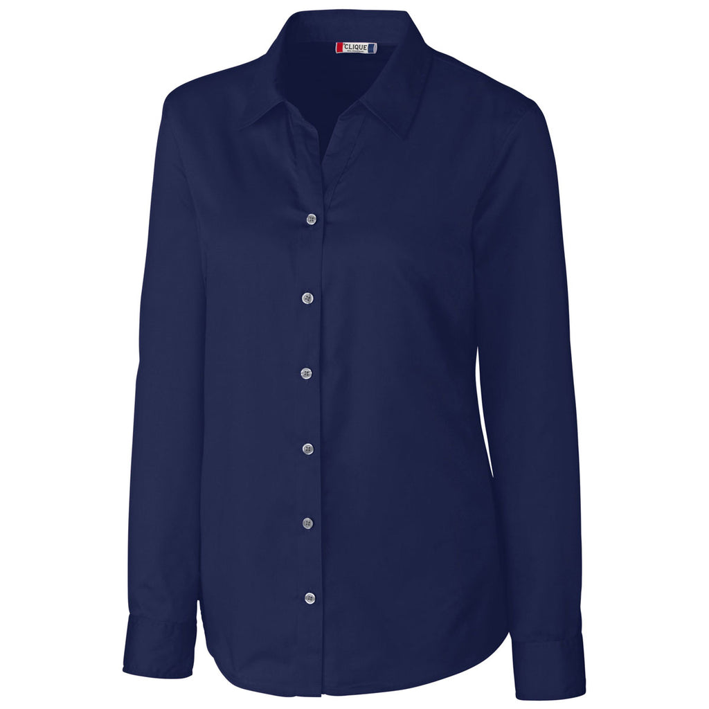 With a spread collar, the custom logoed Clique Women's Navy Long Sleeve Avesta Stain Resistant Twill long sleeve shirt will grab the attention of your professional peers at the next industry trade show. Turn the focus on the fashionable shirt into sales by attaching your company logo on the large embroidery area. Blended cotton and polyester deliver the one-two company apparel punch of supreme smoothness and long lasting durability. Adjustable buttoned cuffs ensure your enjoy plenty of arm movement flexibility to keep you comfortable throughout an all day sales conference. Give the long sleeve shirt to the potential customers you meet at civic events.Corresponding Men's Style: Clique Men's Navy Long Sleeve Avesta Stain Resistant Twill