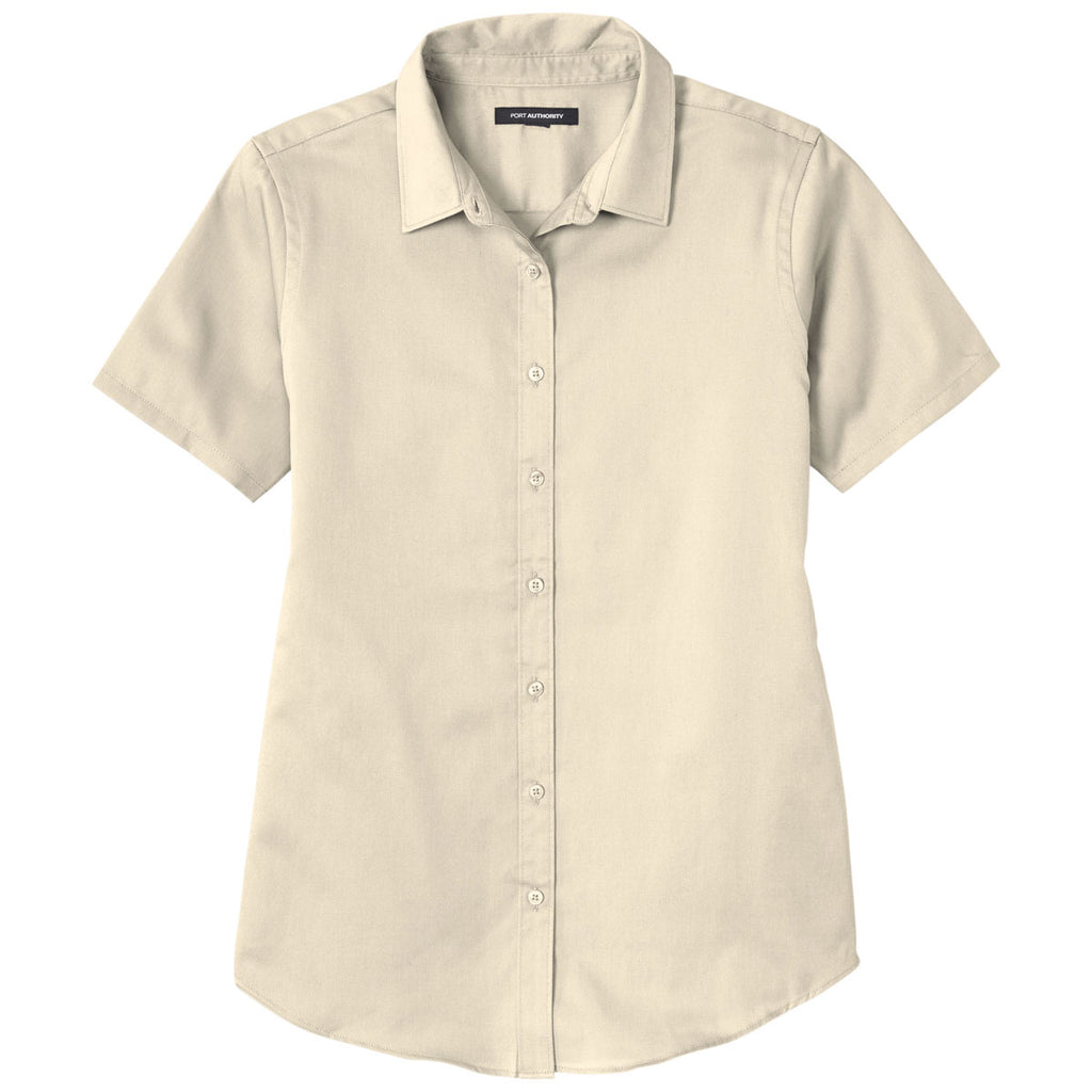 Sport a professional look with the custom embroidery Port Authority Women's Ecru Short Sleeve SuperPro React Twill Shirt. This shirt not only offers a professional look that is perfect for corporate apparel, but is tough enough to stand up to a hard da work. The wrinkle-resistant shirt is soft and smooth for a polished look. Stain release paired with easy care means you can wear this daily without concern. Add a company logo to create community among employees with employee apparel or add a custom logo to include this in a logoed apparel line. The choice is yours.Highlights
