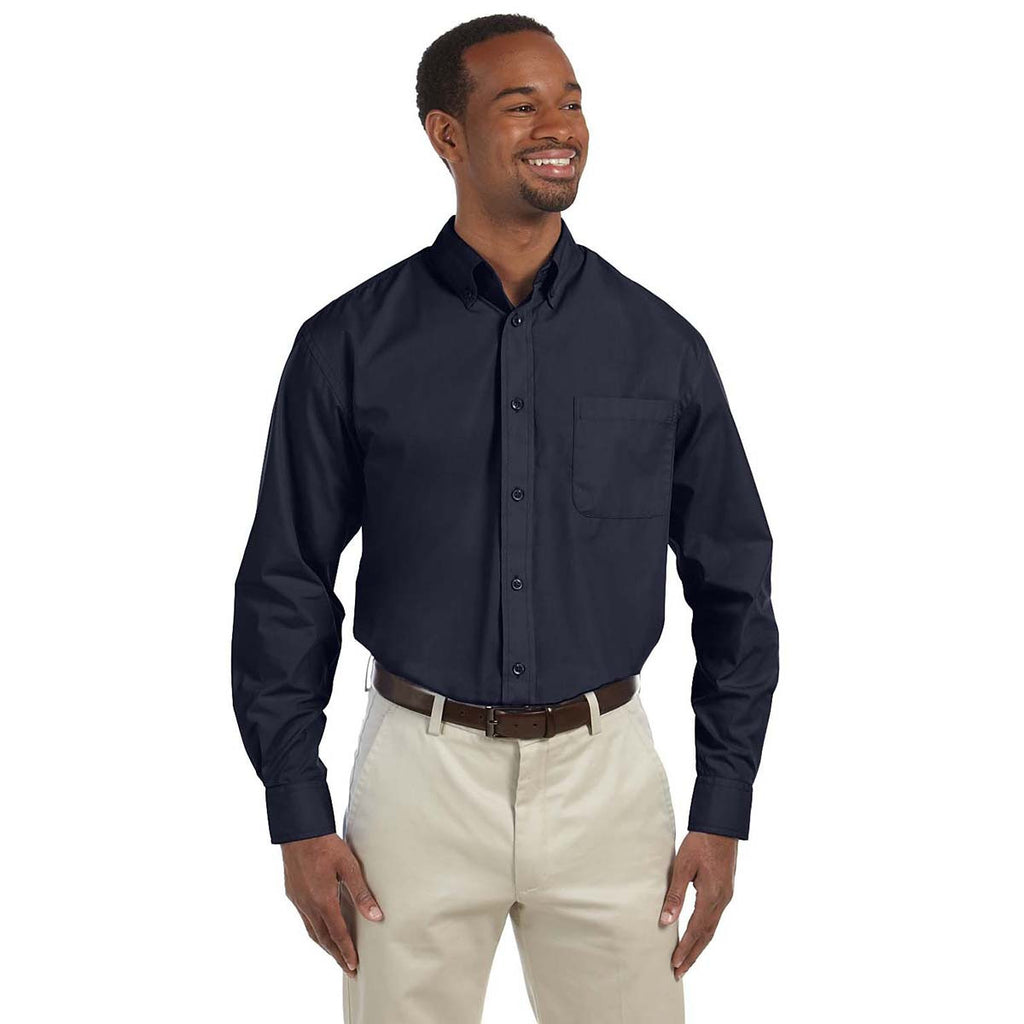 Thirty-five percent cotton poplin gives the Harriton Men's Navy 3.1 oz. Essential Poplin its super soft feel. The remaining polyester ensures the stylish shirt resists rips and tears. Extra stitching at the seams and buttons bolster the strength of the long-sleeve shirt. Two-button adjustable cuffs complement the button down collar to create a versatile shirt to wear at the office and during visits to upscale restaurants. The left chest pocket offers convenient storage for a Smartphone. Attach your corporate label to spread the word about your business. Corporate logoed apparel makes ideal gifts for your employees.Corresponding Women's Style: Harriton Women's Navy 3.1 oz. Essential Poplin