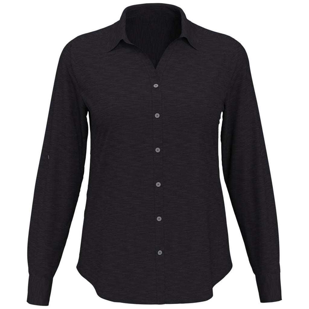 Add embroidery to the Perry Ellis Women's Caviar Black Heathered Woven Shirt for a fun and flirty work that can be dressed up or down as needed. The button-up V-neck has a feminine fit with sleeves that can be converted to 3/4 with ease. Ideal for work, hanging out, or a fun night with friends. Place an order today.Corresponding Men's Style: Perry Ellis Men's Caviar Black Heathered Woven Shirt