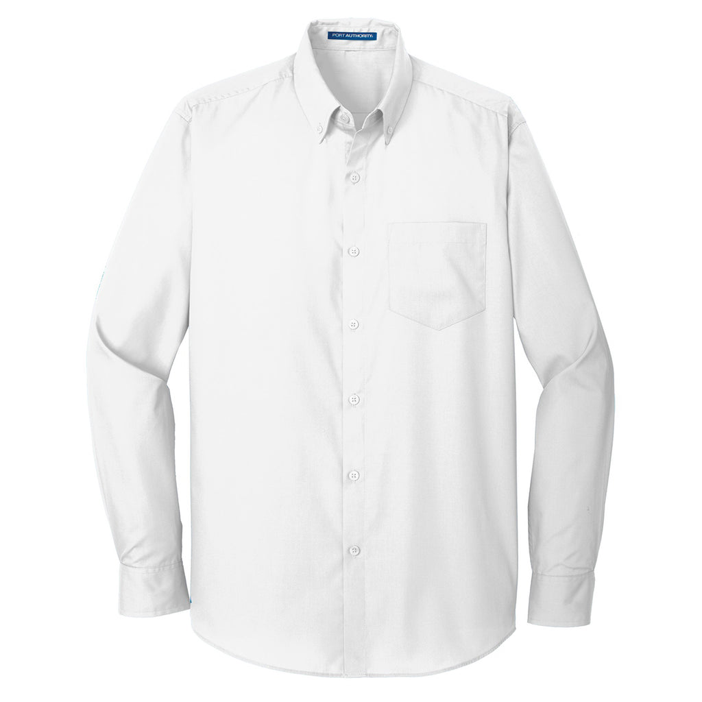 Stain release technology ensures you always look your professional best wearing the logoed Port Authority Men's White Tall Long Sleeve Carefree Poplin Shirt. Super smooth cotton and tough to tear polyester give you a highly breathable corporate shirt that works fashionably well for all occasions. Wear the poplin shirt to a business conference during the day and keep the stylish shirt on at night dining at your favorite restaurant. The button down collar presents a refined appearance that gets you noticed at professional networking events. Remember to attach your corporate logo to take advantage of the attention. This dress shirt makes sure your team looks unified and professional as they educate potential customers on your brand.Highlights