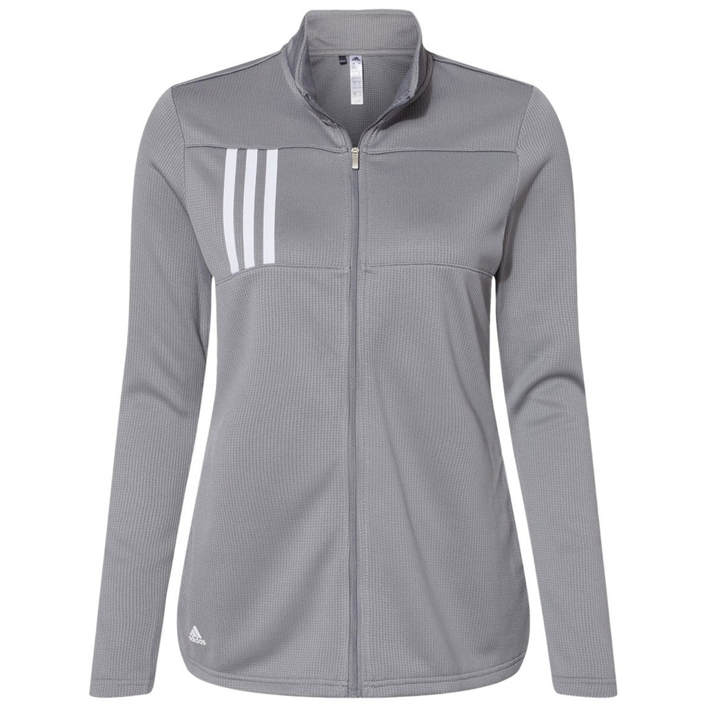 Your custom logo will stand out on the adidas Women's Grey Three/White 3-Stripes Double Knit Full-Zip made of 100% recycled polyester. The beautiful waffle texture knit construction has a self-collar and moisture management properties to keep you looking and feeling your best as you go about your day. Add a company logo to offer as employee gifts or as a unique choice for employee apparel. The full zip style allows for easy on and off of the double knit whether you are headed out on your morning commute or going for a jog in the park.