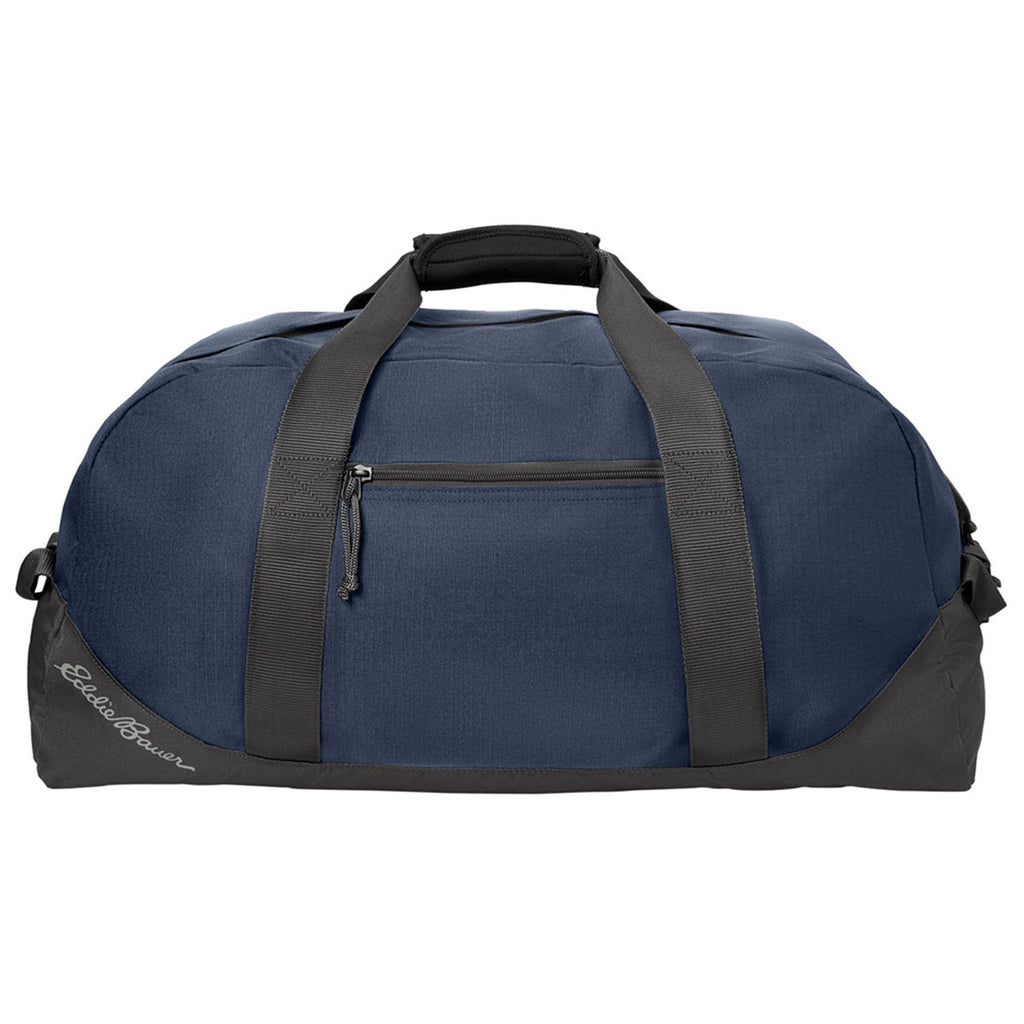 If Eddie Bauer knows one thing, it's durability. And there's no better demonstration of that than what you'll find with this Eddie Bauer Coast Blue/Grey Steel Large Ripstop Duffel. Go ahead-try the polyester ripstop fabric. Try the padded grip handles, the end haul handles, and the detachable padded shoulder strap. Try and see if you can break it. Okay, you'd better not-but we're willing to bet that this duffel will put up as good a fight as any if you were to put it to the test. Luckily, that work's all done for you. All you have to do is add your logo to brand this item for your own corporate swag. This all-utility duffel is sized for an overnight getaway or an extended adventure. Built from durable ripstop, it has a spacious main compartment for unrestricted packing. A secure zippered front pocket safely stores smaller items.